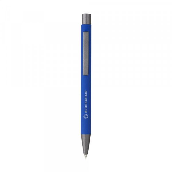 Blauwschrijvende, aluminium balpen met rubberized soft touch finish, stevige metalen clip en...meer