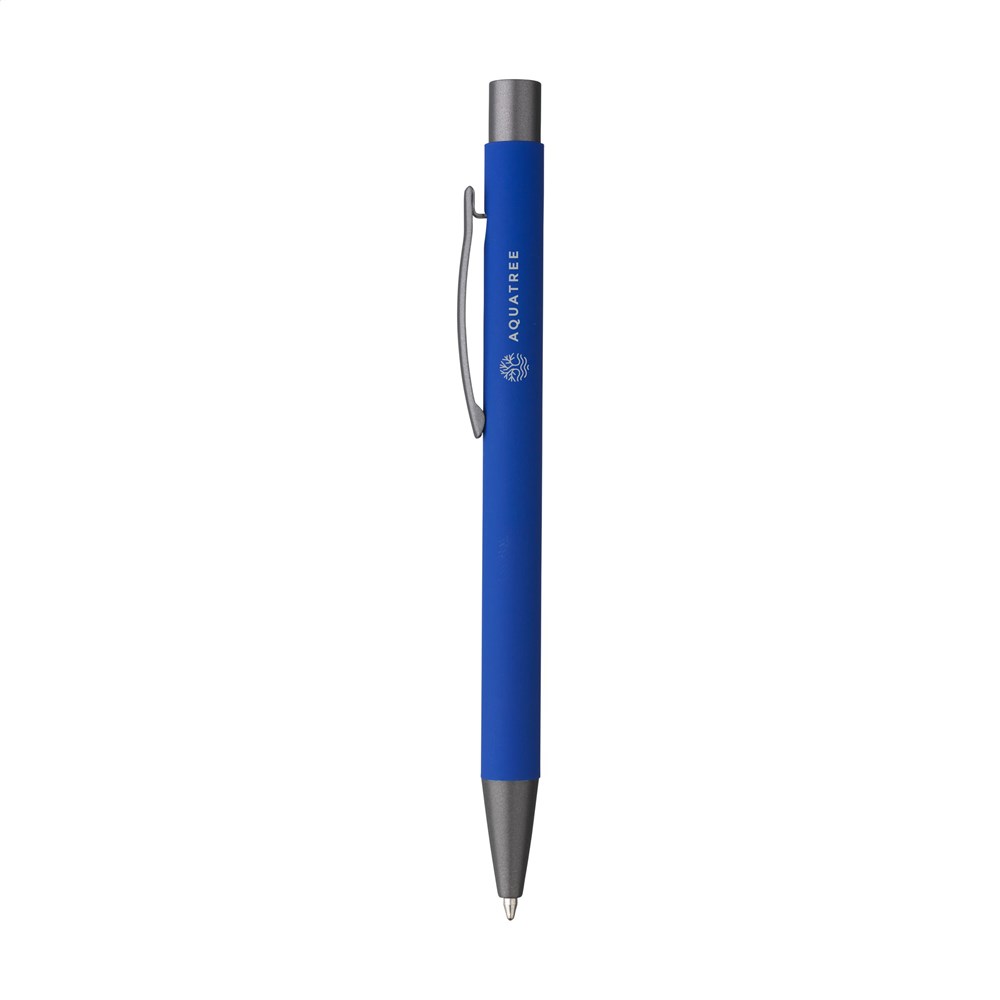Blauwschrijvende, aluminium balpen met rubberized soft touch finish, stevige metalen clip en kunststof puntstuk en drukknop.