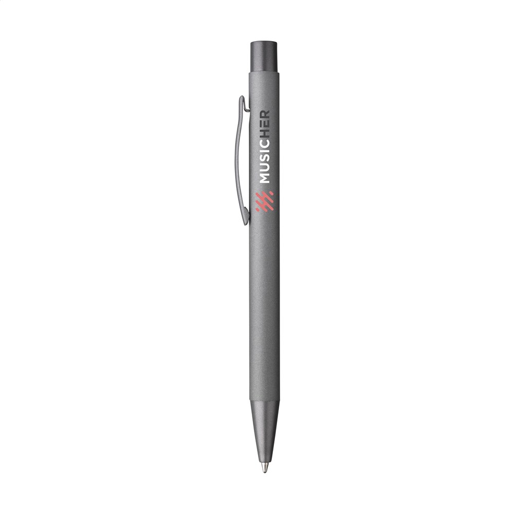 Blauwschrijvende, aluminium balpen met rubberized soft touch finish, stevige metalen clip en kunststof puntstuk en drukknop.