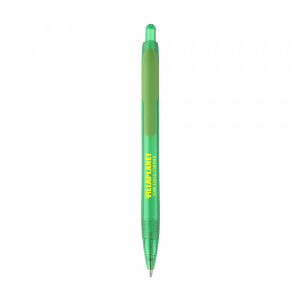 Blauwschrijvende balpen met mattransparante houder, transparante drukknop en puntstuk en solid clip.