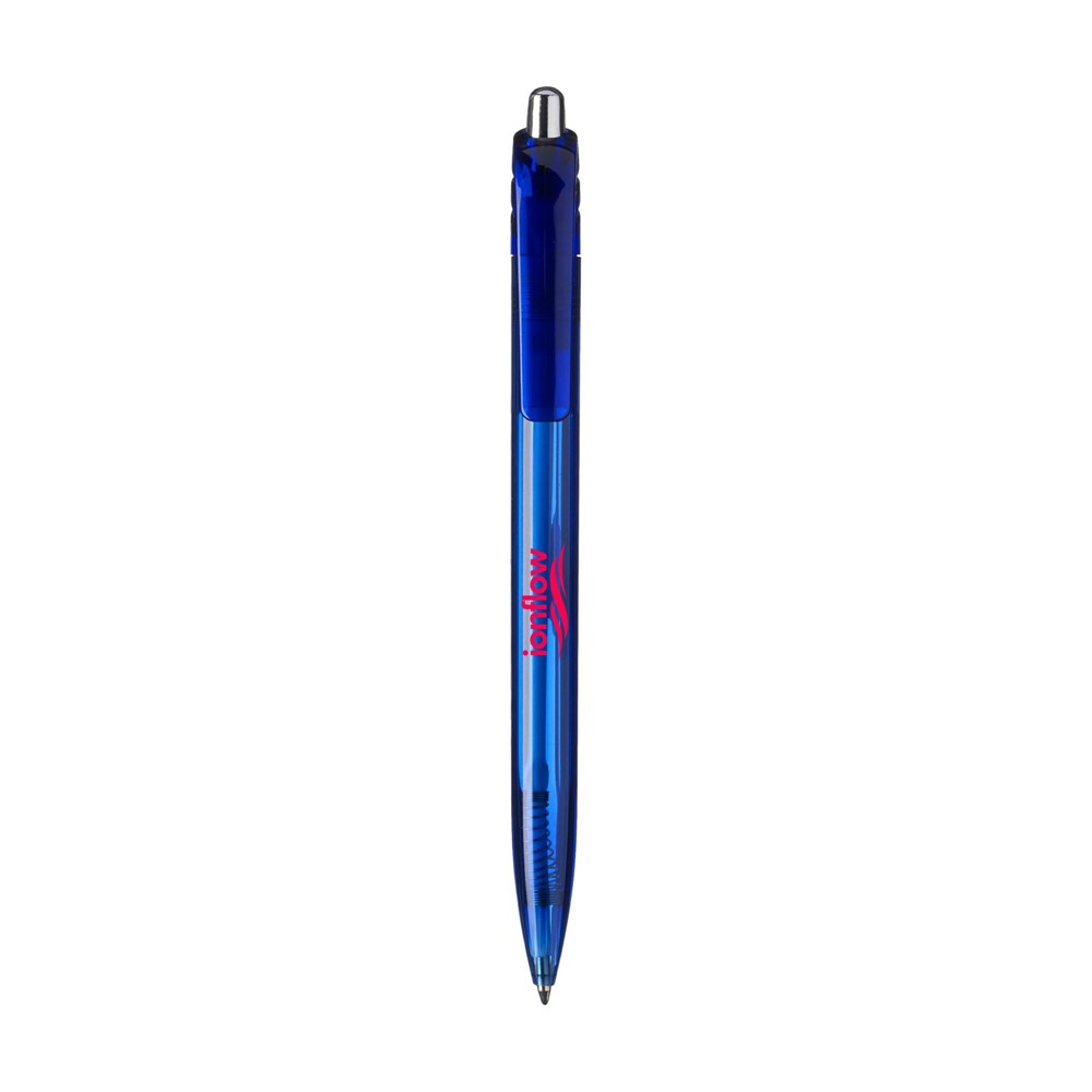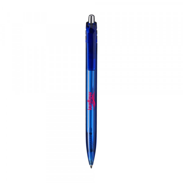 Blauwschrijvende, transparantgekleurde balpen met fraai gebogen clip en zilverkleurige drukknop.
