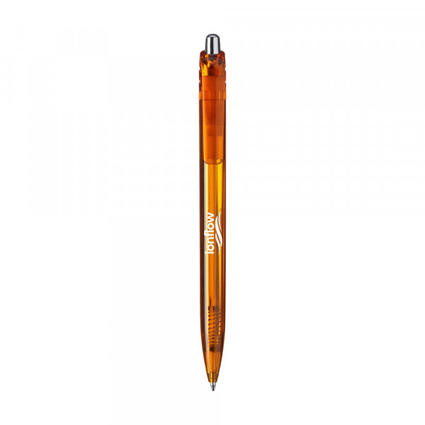 Blauwschrijvende, transparantgekleurde balpen met fraai gebogen clip en zilverkleurige drukknop.