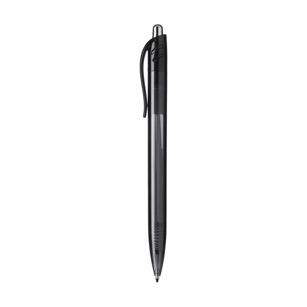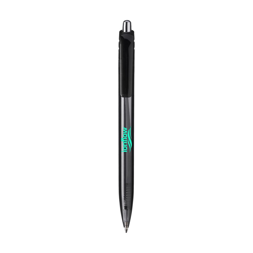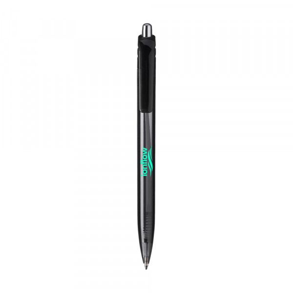 Blauwschrijvende, transparantgekleurde balpen met fraai gebogen clip en zilverkleurige drukknop.