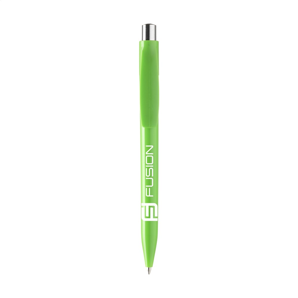 Blauwschrijvende balpen. Met matchend kleuraccent in de zilverkleurige drukknop.