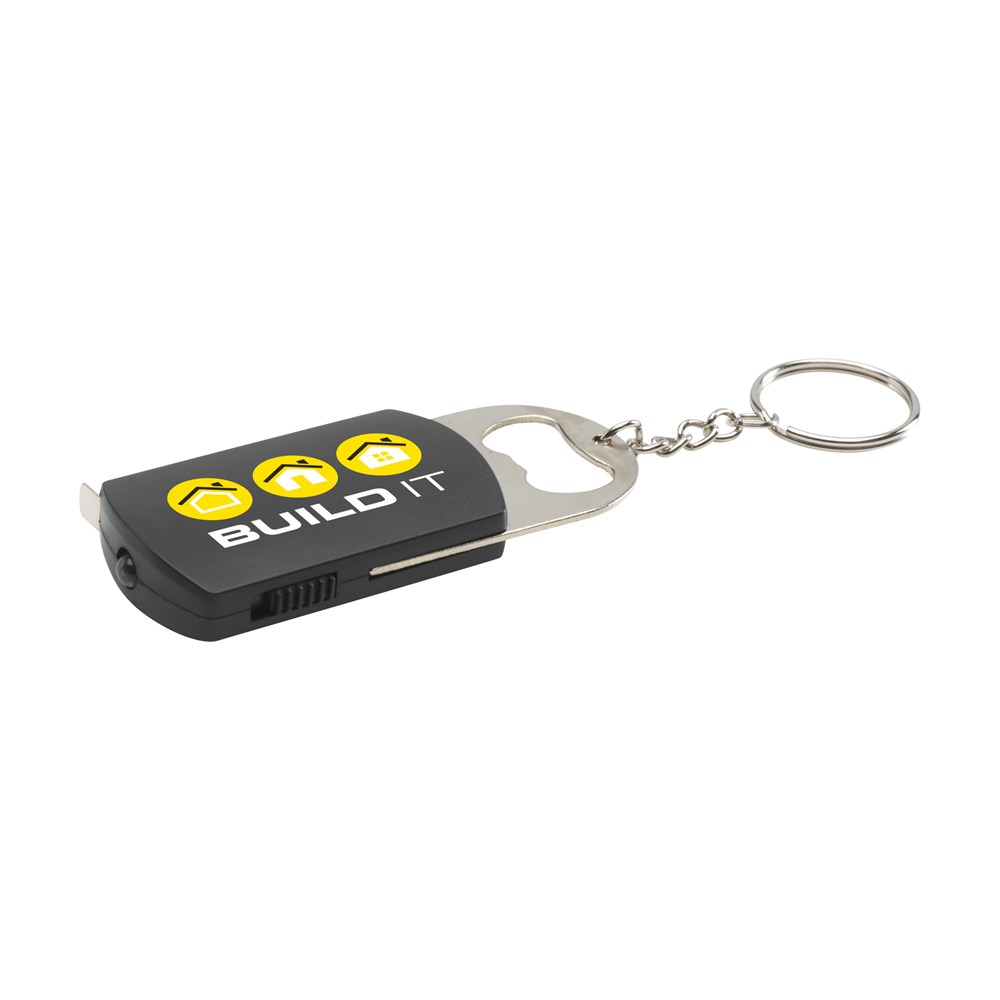 Multifunctionele sleutelhanger met stevige sleutelring, flesopener, energiezuinig LED-lampje en rolmaat met aanduiding in inches en centimeters (lengte 100 cm). Incl. celbatterijen.