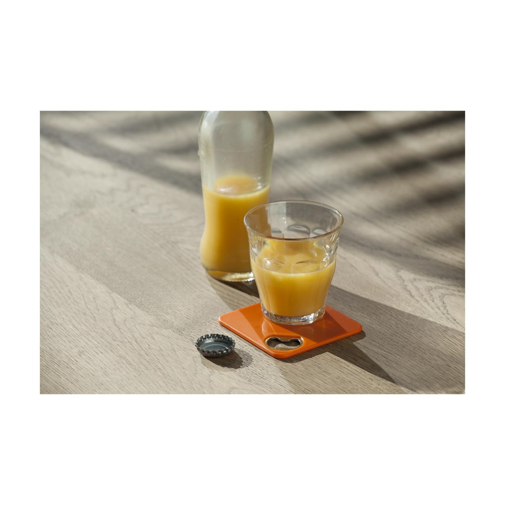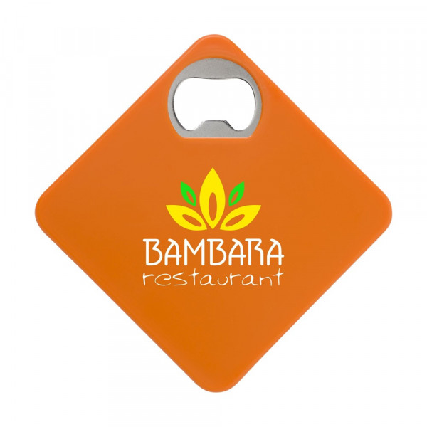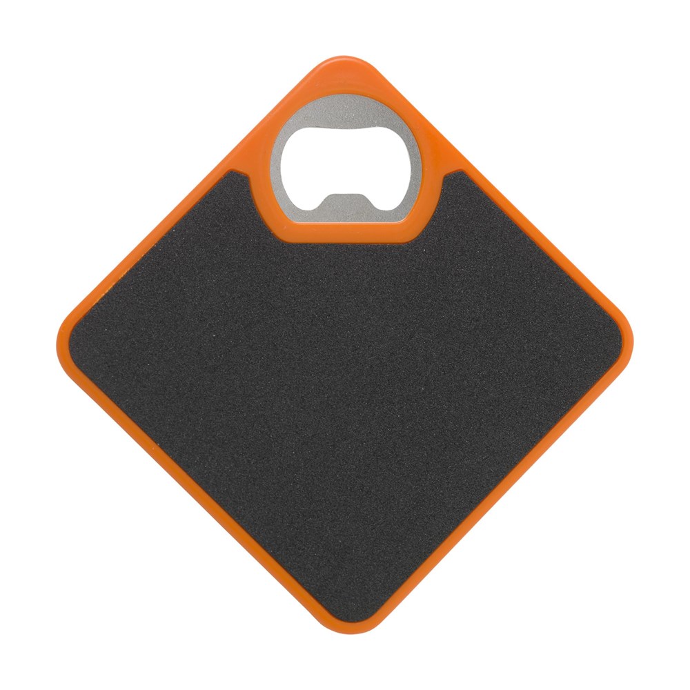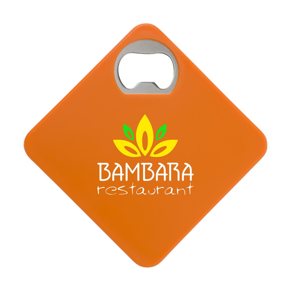 Onderzetter en metalen opener ineen. Met slipvaste onderzijde. Ook te bedrukken met je eigen foto, logo of zelfontworpen design in full colour. Zeer geschikt om te verzenden met een direct mail.