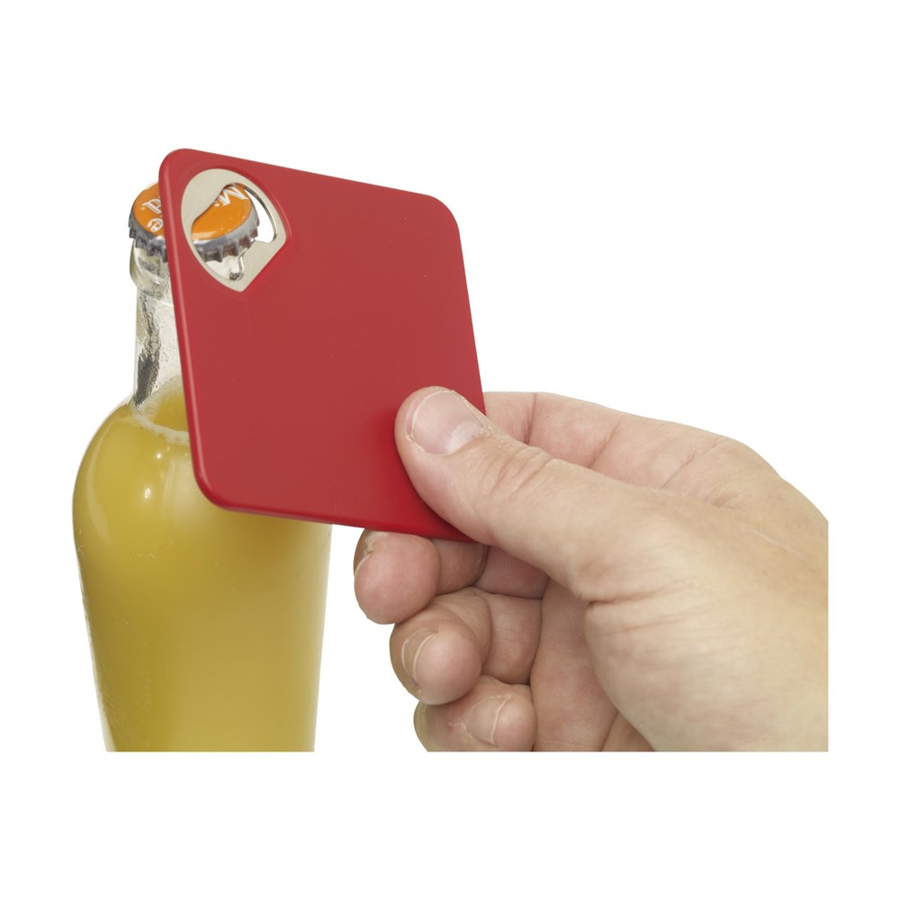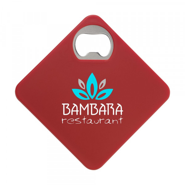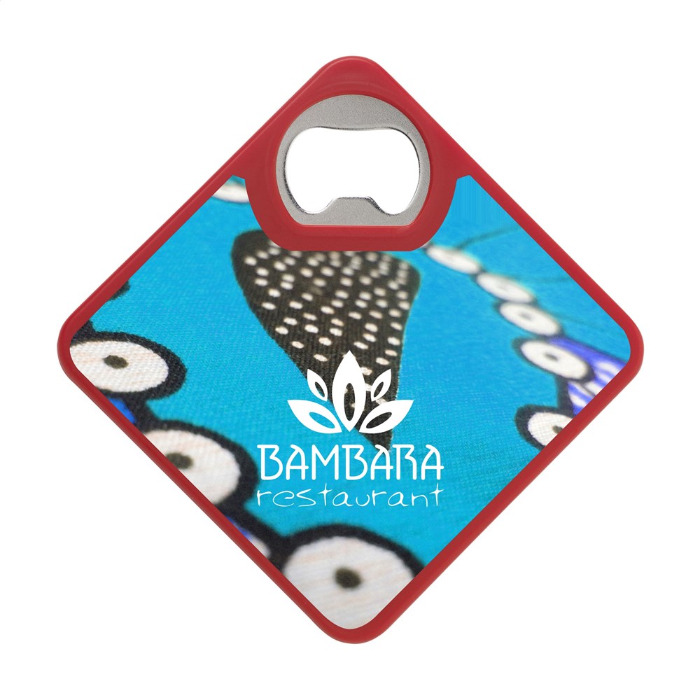 Onderzetter en metalen opener ineen. Met slipvaste onderzijde. Ook te bedrukken met je eigen foto, logo of zelfontworpen design in full colour. Zeer geschikt om te verzenden met een direct mail.
