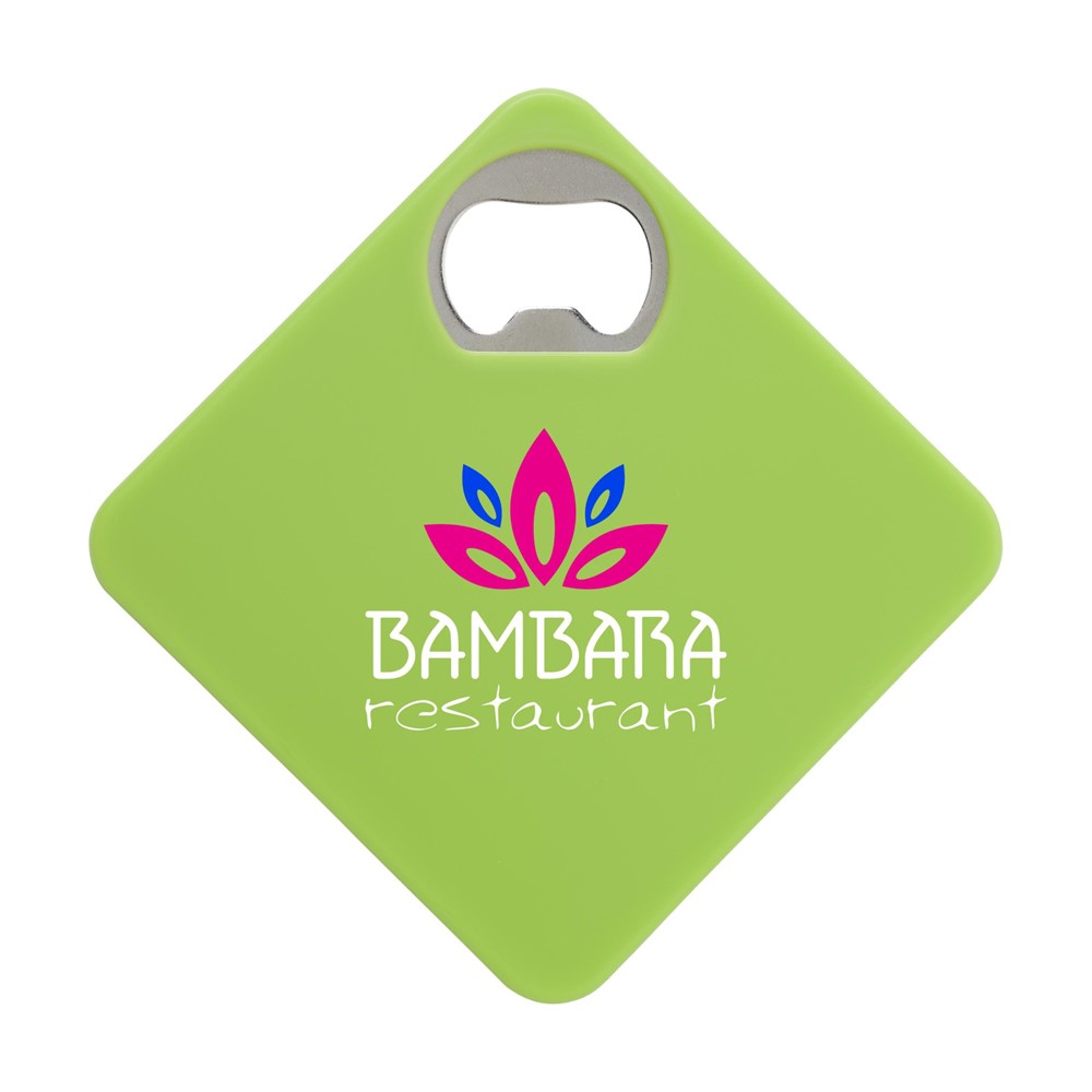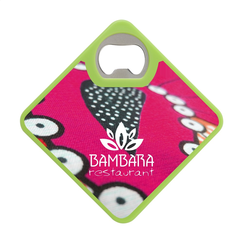 Onderzetter en metalen opener ineen. Met slipvaste onderzijde. Ook te bedrukken met je eigen foto, logo of zelfontworpen design in full colour. Zeer geschikt om te verzenden met een direct mail.