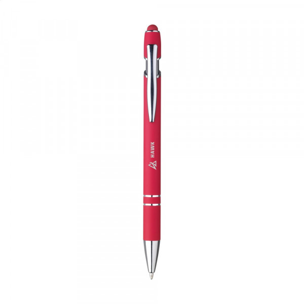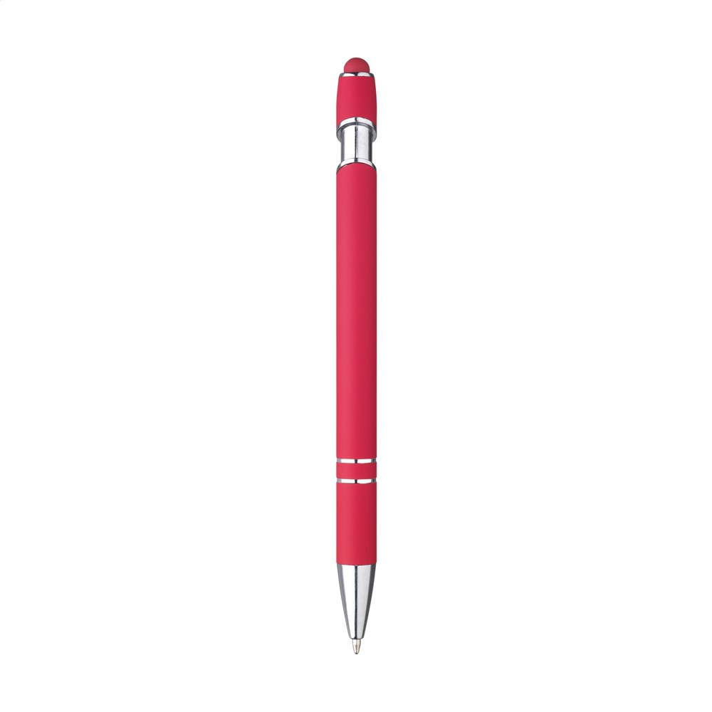 Slanke, blauwschrijvende balpen met aluminium houder. Voorzien van een rubberized soft touch finish en een rubberen top/pointer. Stevige metalen clip en kunststof puntstuk.