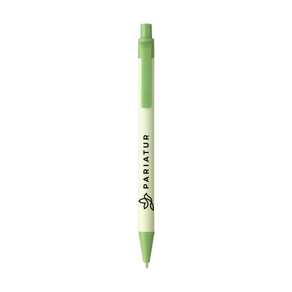Eco-vriendelijke balpen met houder van gerecycled papier. De clip, drukknop en het puntstuk zijn van biologisch afbreekbaar PLA. Met blauwschrijvende vulling.