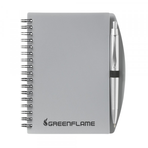 Notitieboek met ca. 70 vel gelinieerd schrijfpapier en transparant kunststof omslag, gebonden in metalen wire-o-binding. Incl. blauwschrijvende balpen.