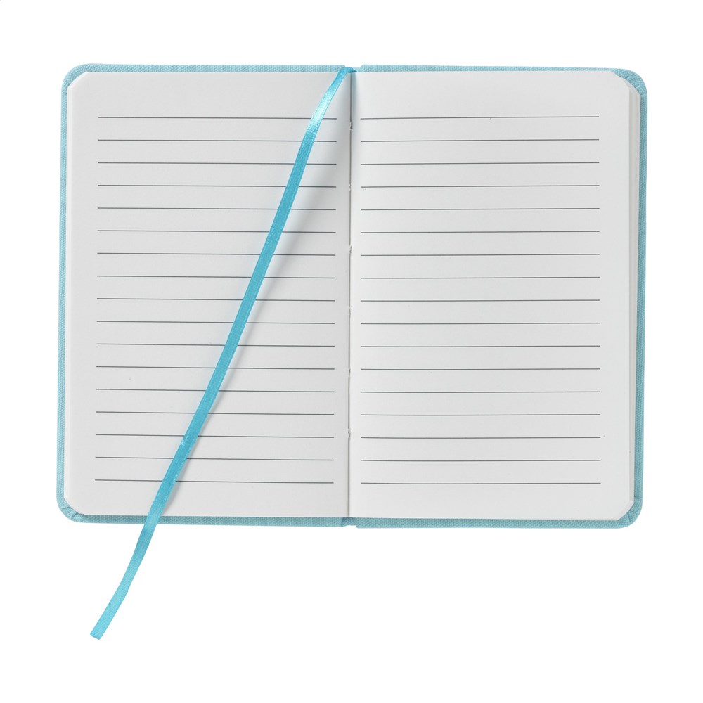 Notitieboekje in A6-formaat. Met katoenen cover, 80 pagina's crèmekleurig gelinieerd papier, elastische sluiting, gebonden rug en zijden leeslint.