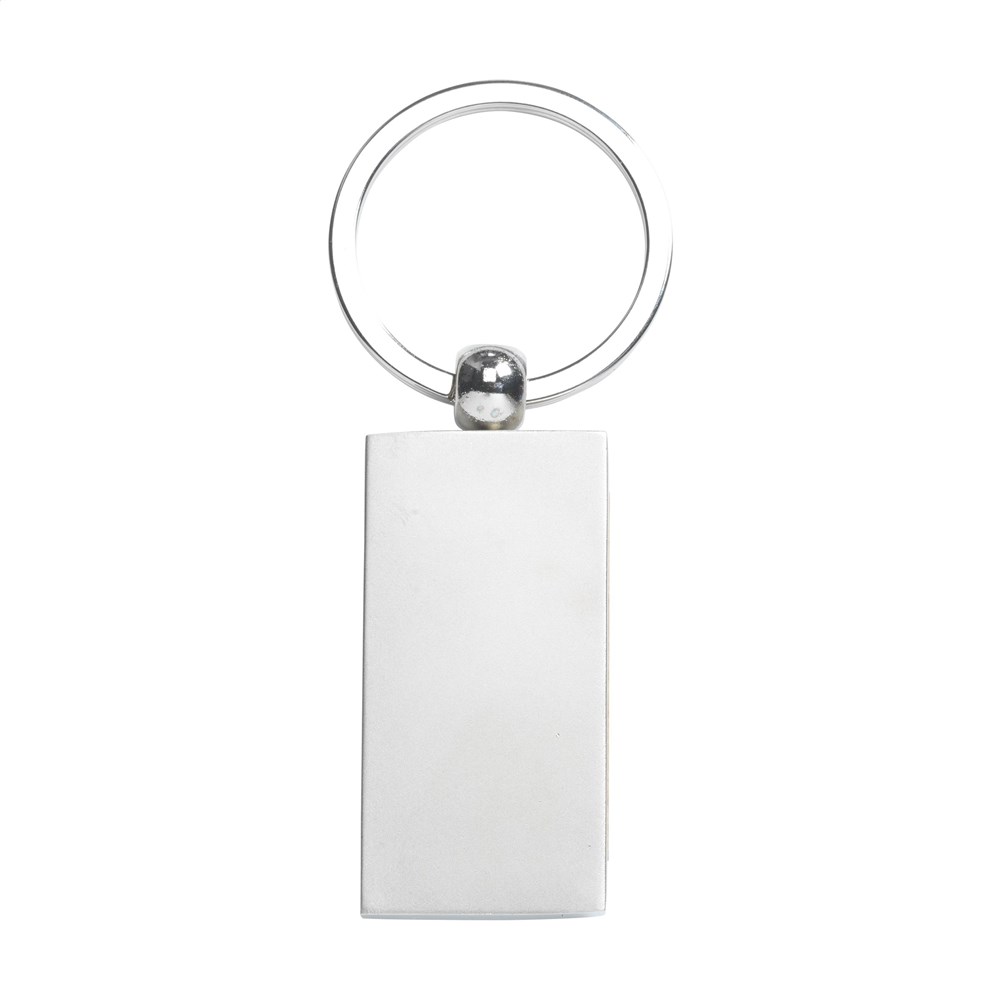 Sleutelhanger in mat metalen uitvoering. Met beukenhouten inleg. Aan stevige, metalen sleutelring. Per stuk in doosje.
