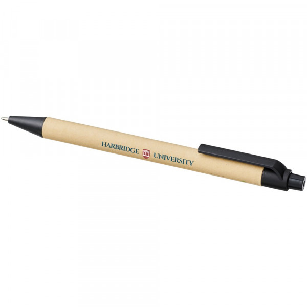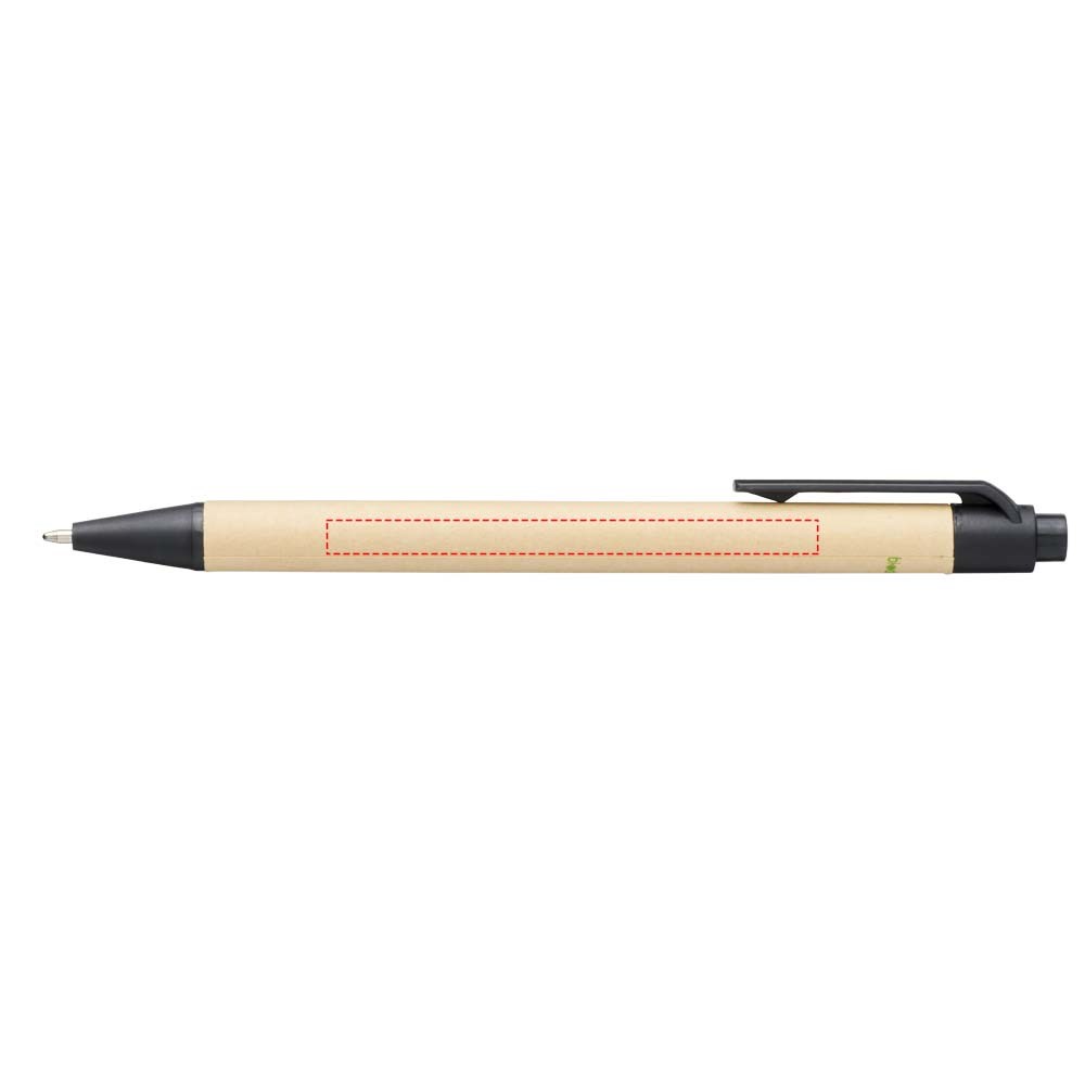 Ecovriendelijke balpen met klikmechanisme, met een huls van biologisch afbreekbaar papiermateriaal en mais plastic sierstrips in verschillende kleuren. De kleur van het gerecyclede karton kan variëren.