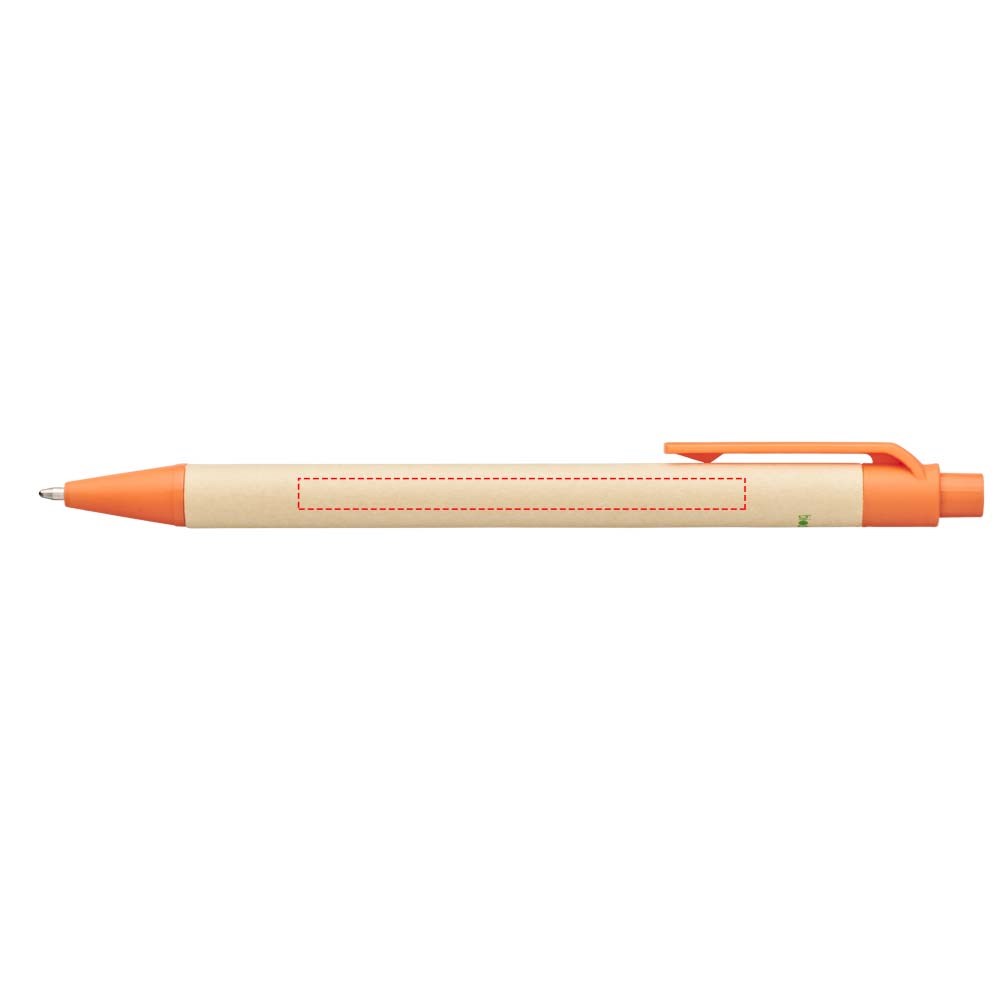 Ecovriendelijke balpen met klikmechanisme, met een huls van biologisch afbreekbaar papiermateriaal en mais plastic sierstrips in verschillende kleuren. De kleur van het gerecyclede karton kan variëren.