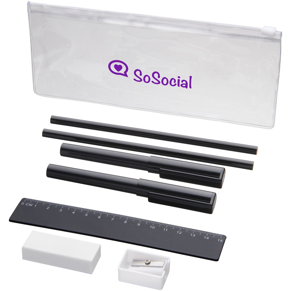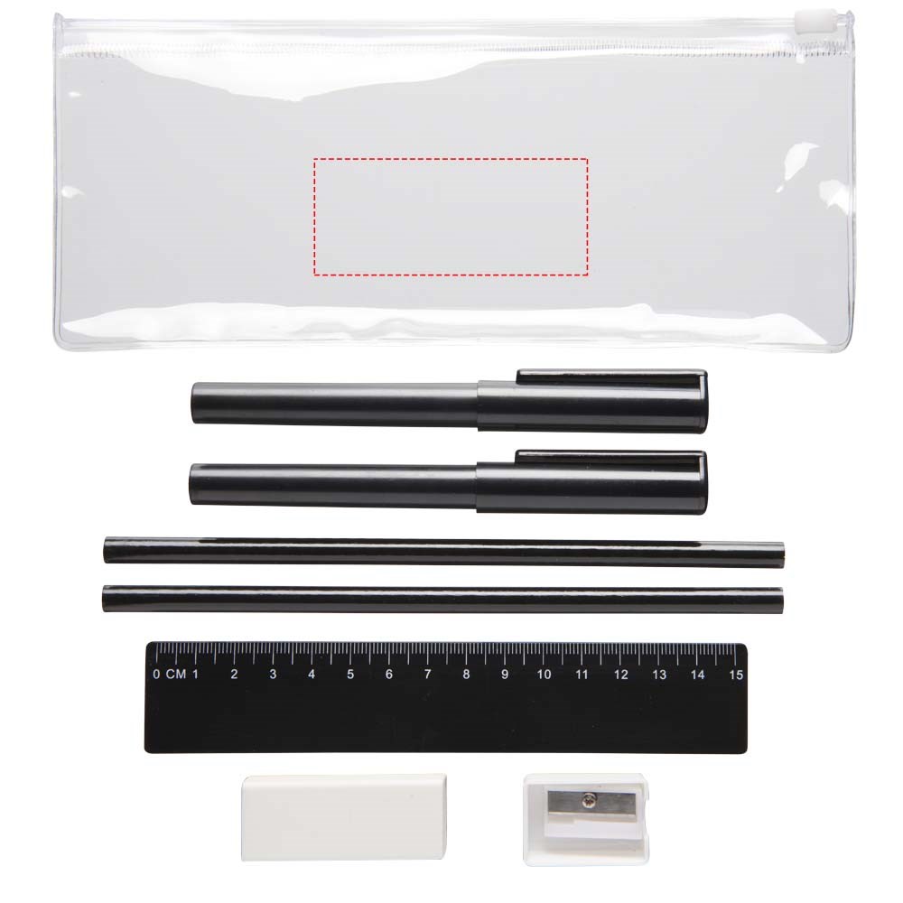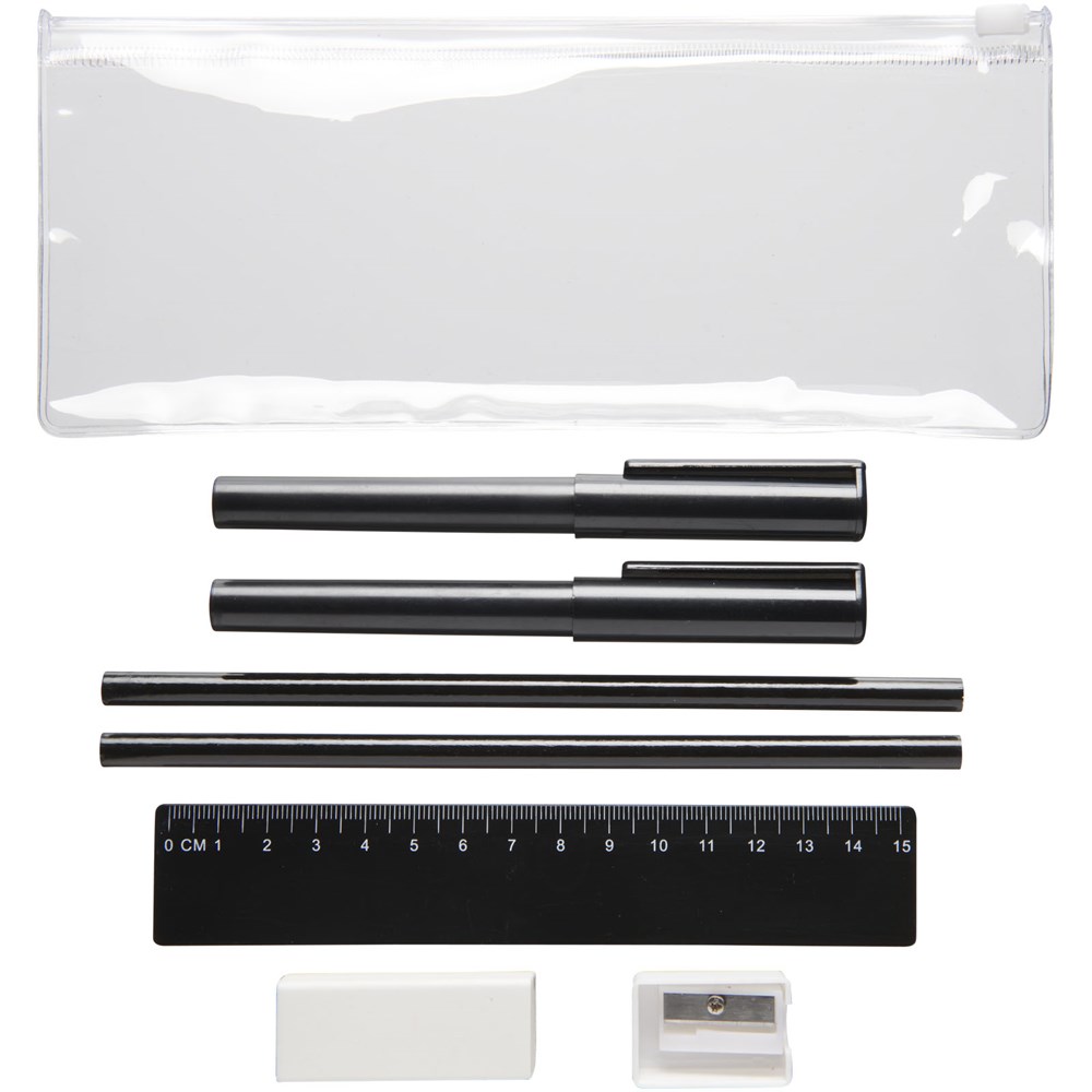 PVC pennenset met 2 balpennen (1 met zwarte inkt, de andere met blauw), 2 potloden, een liniaal, een puntenslijper en een gum.