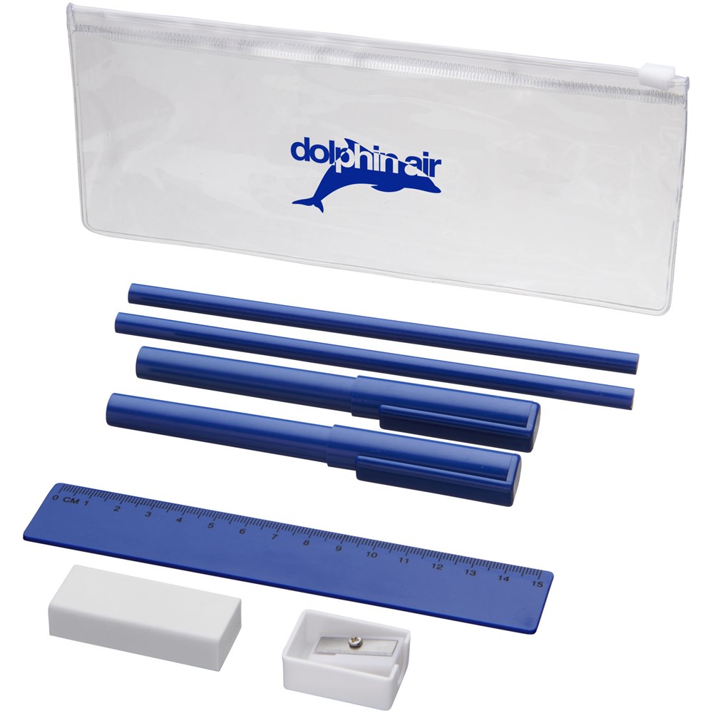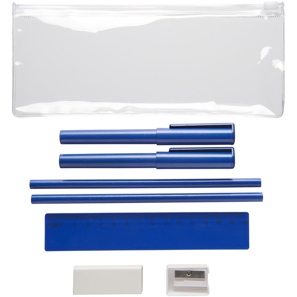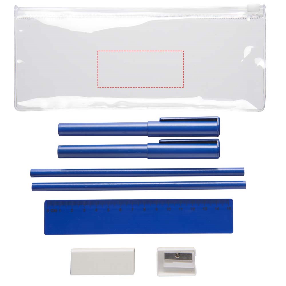 PVC pennenset met 2 balpennen (1 met zwarte inkt, de andere met blauw), 2 potloden, een liniaal, een puntenslijper en een gum.