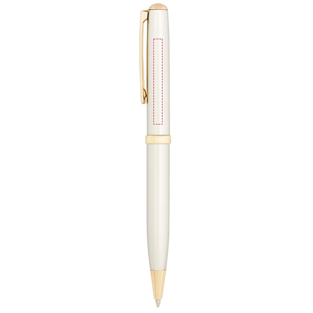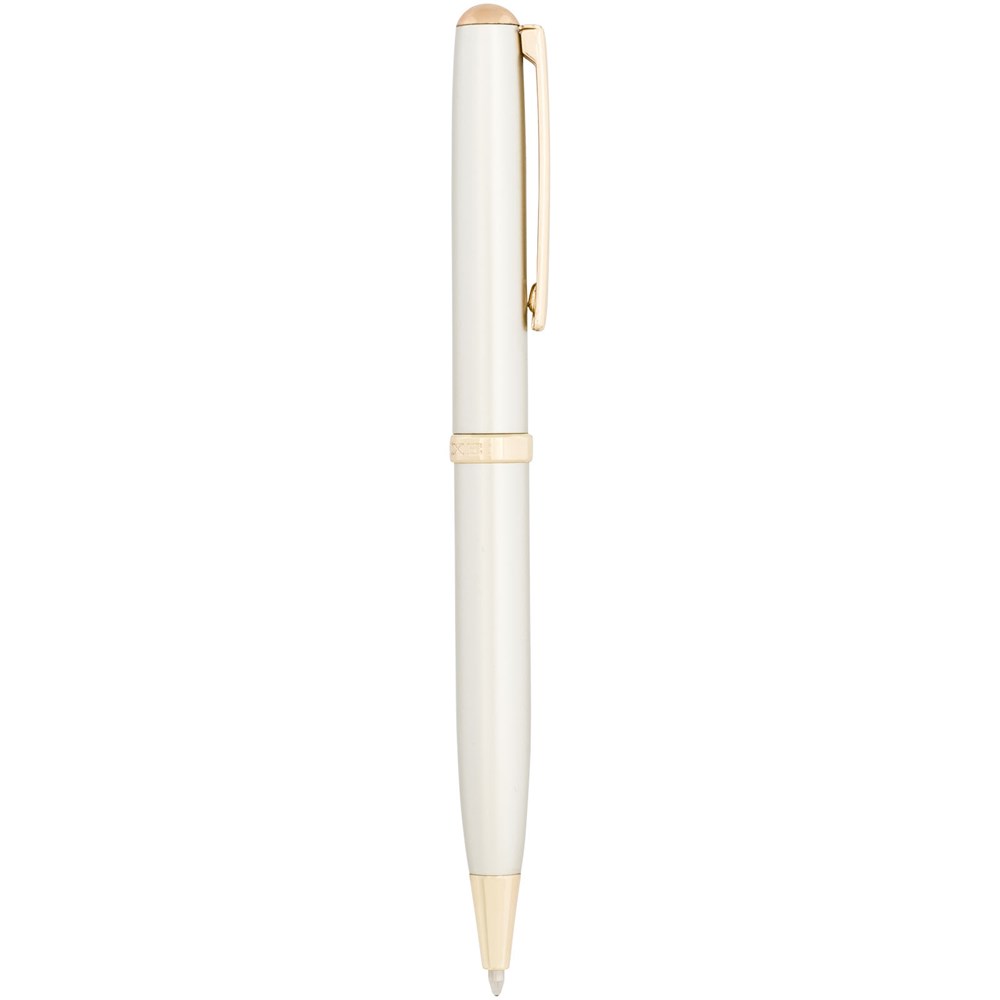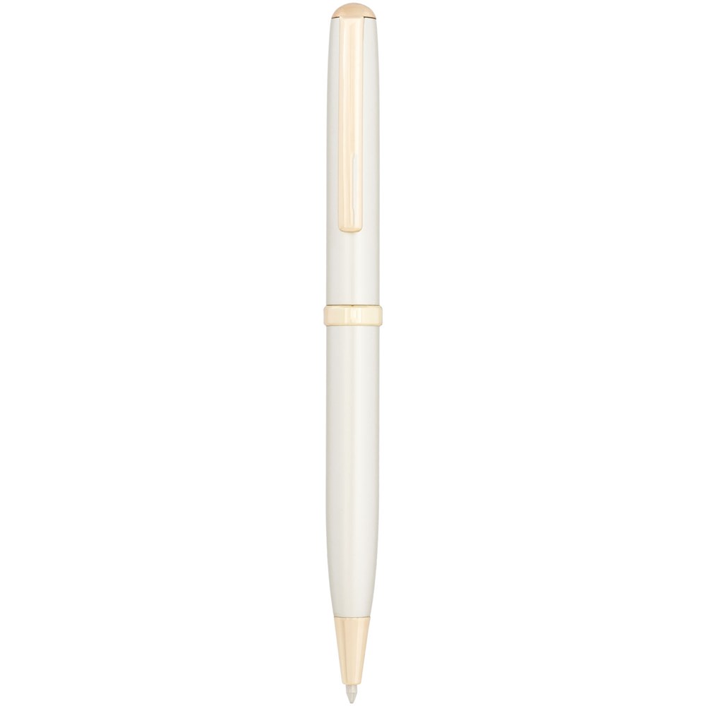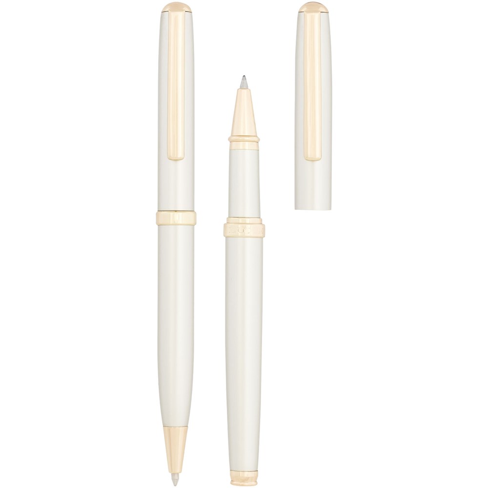 Een moderne pennenset bestaande uit een balpen met draaimechanisme en een rollerbalpen met dop, geleverd in een luxe geschenkverpakking. Allemaal afgewerkt met een matgouden vat en glanzende gouden onderdelen. Inclusief een premium vulling voor beide pennen. Bovenhuls met goudgeverfde onderlaag. Grootte van de balpen: 13,4cm, 1,05 cm, gewicht: 23 gr, schrijflengte: 800 m. Grootte van de rollerbalpen: 13,5 cm, 1,05 cm, gewicht: 23 gr, schrijflengte: 400 m.
