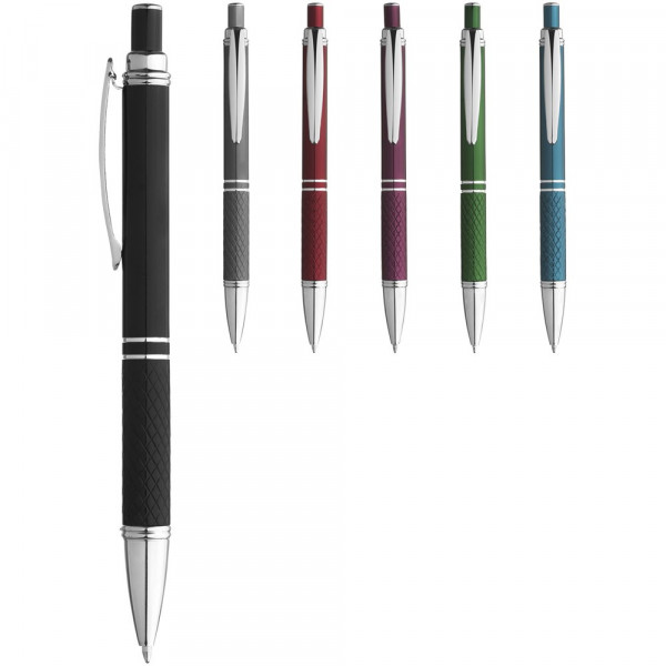 Balpen met klikmechanisme met gekartelde greep. Zwartschrijvend.