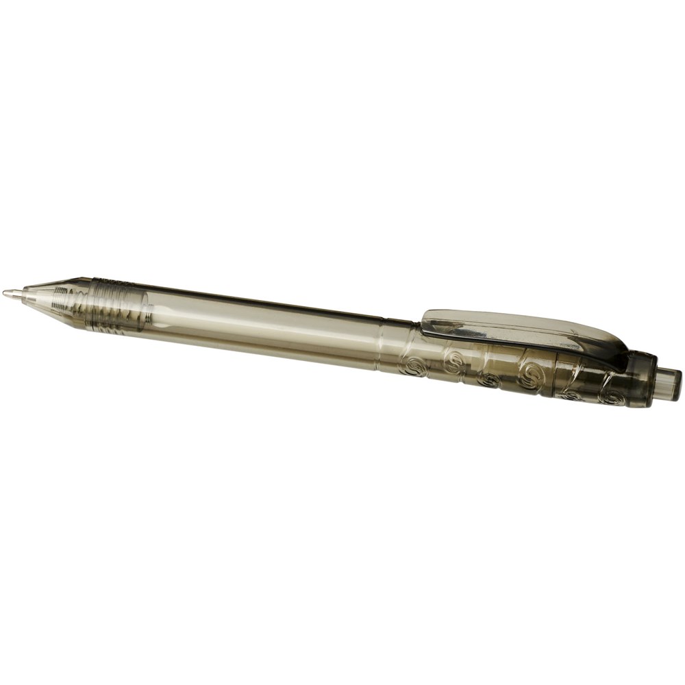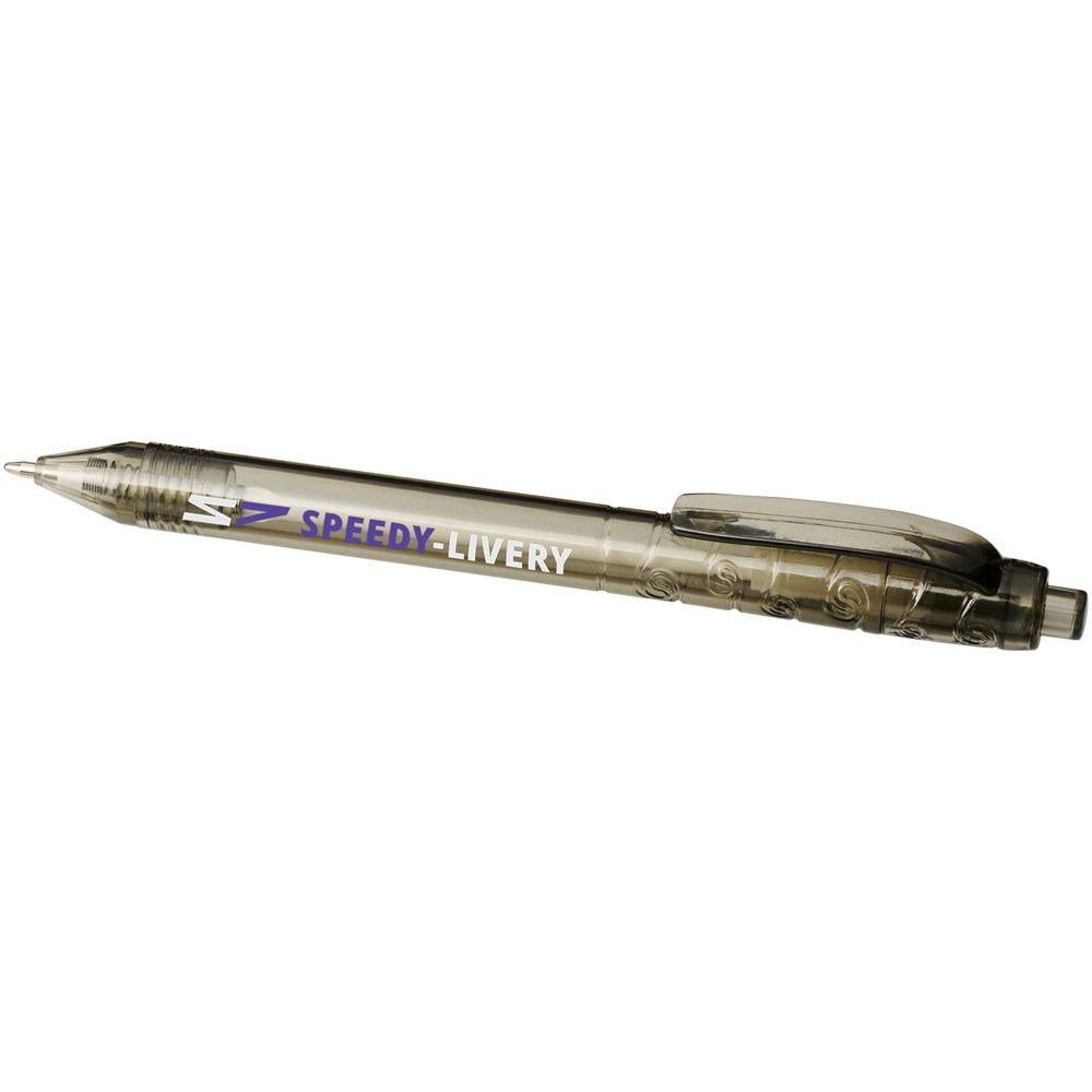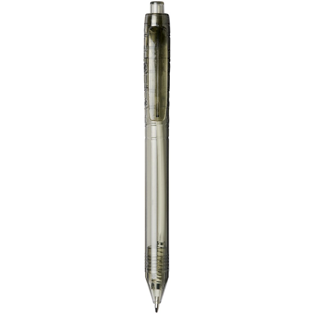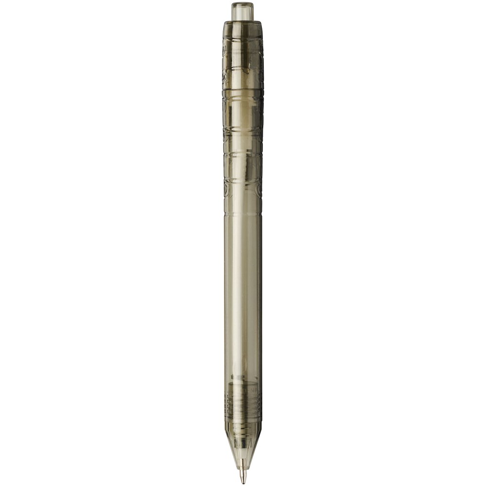 Balpen met klikmechanisme met een transparante huls. Het huls is gemaakt van gerecyclede waterflessen, wat bijdraagt aan het verminderen van de hoeveelheid plastic afval.
