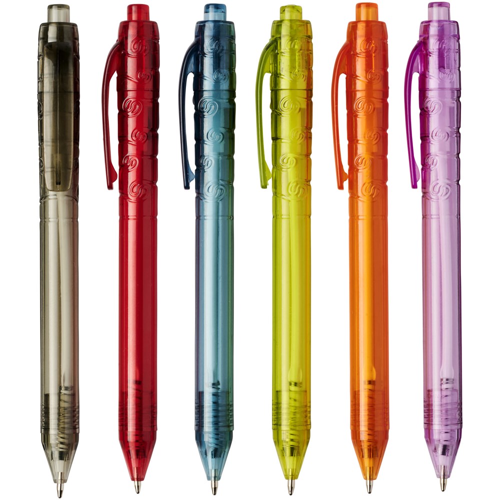 Balpen met klikmechanisme met een transparante huls. Het huls is gemaakt van gerecyclede waterflessen, wat bijdraagt aan het verminderen van de hoeveelheid plastic afval.