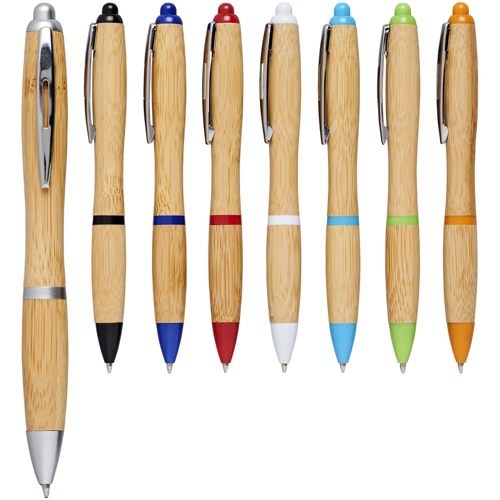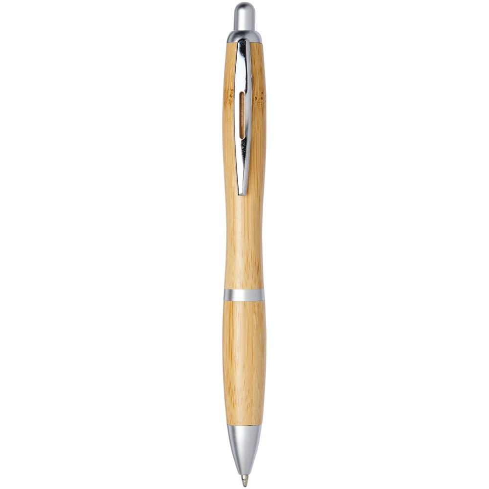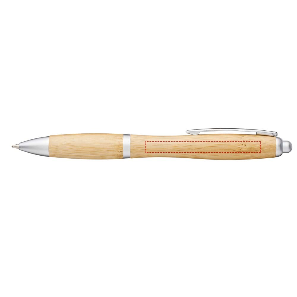 Balpen met klikmechanisme, met een huls van bamboe, geaccentueerd door een verchroomde clip en ABS kunststof sierranden. De kleur van het bamboemateriaal kan variëren.