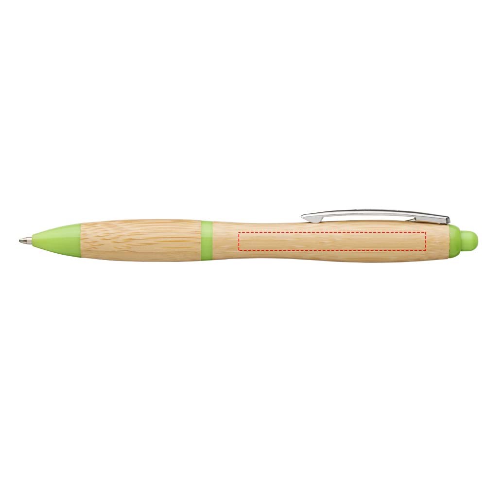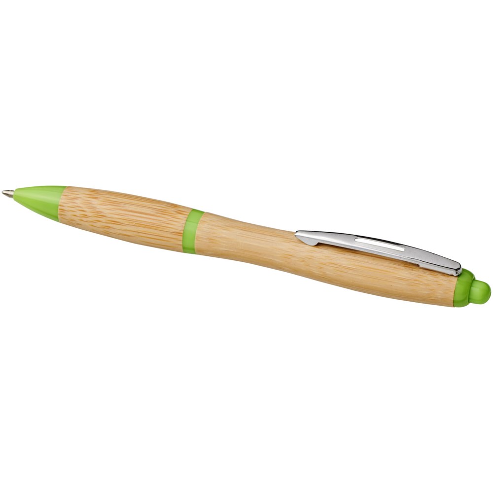 Balpen met klikmechanisme, met een huls van bamboe, geaccentueerd door een verchroomde clip en ABS kunststof sierranden. De kleur van het bamboemateriaal kan variëren.