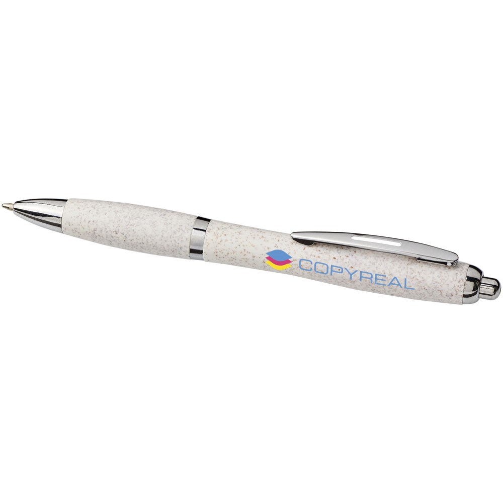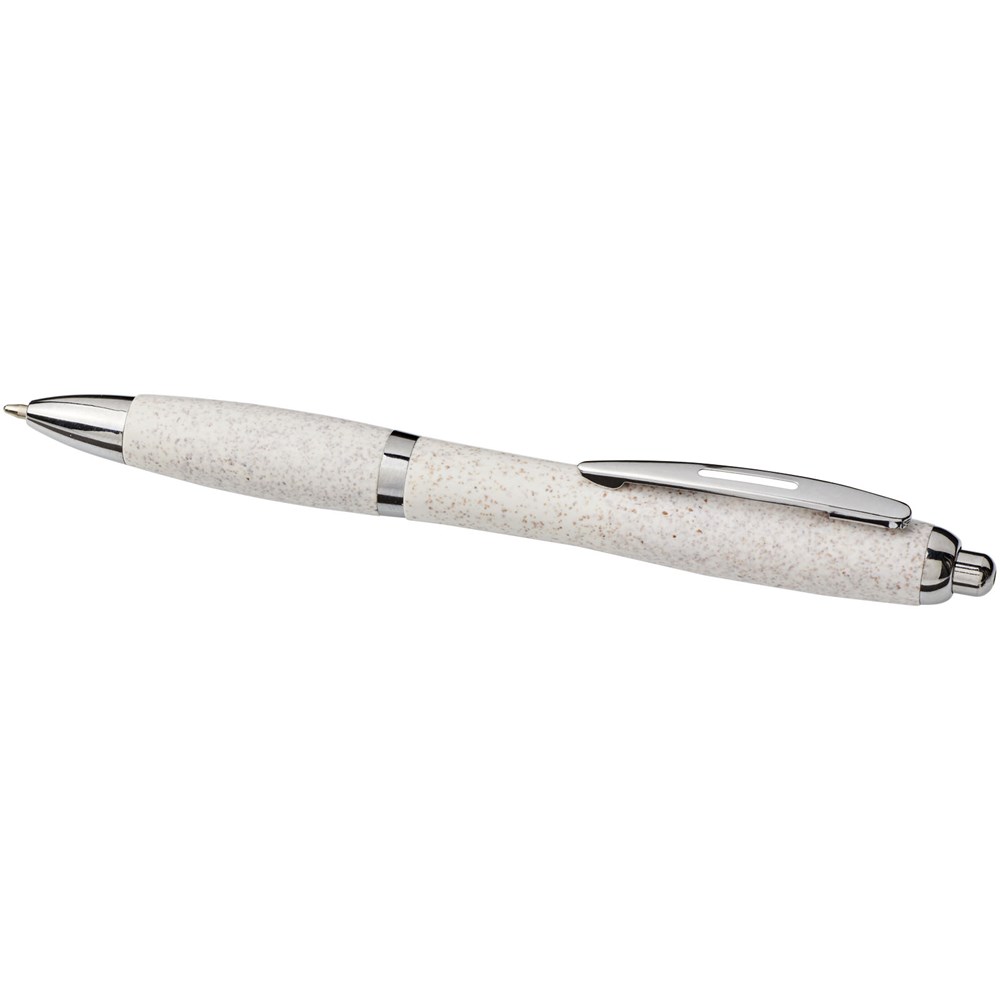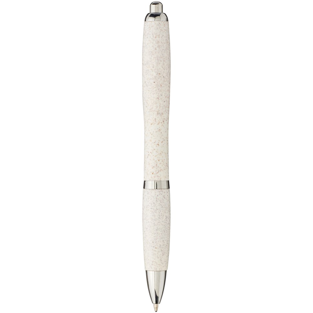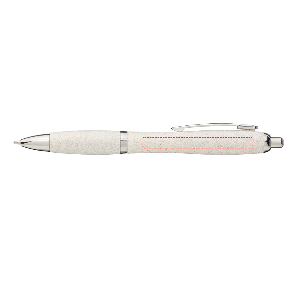 Balpen met klikmechanisme, met een huls van tarwestro en afgewerkt met opvallende chroomkleurige details. Na het oogsten van de tarwekorrels blijft er tarwestro over, waardoor er minder plastic wordt gebruikt.