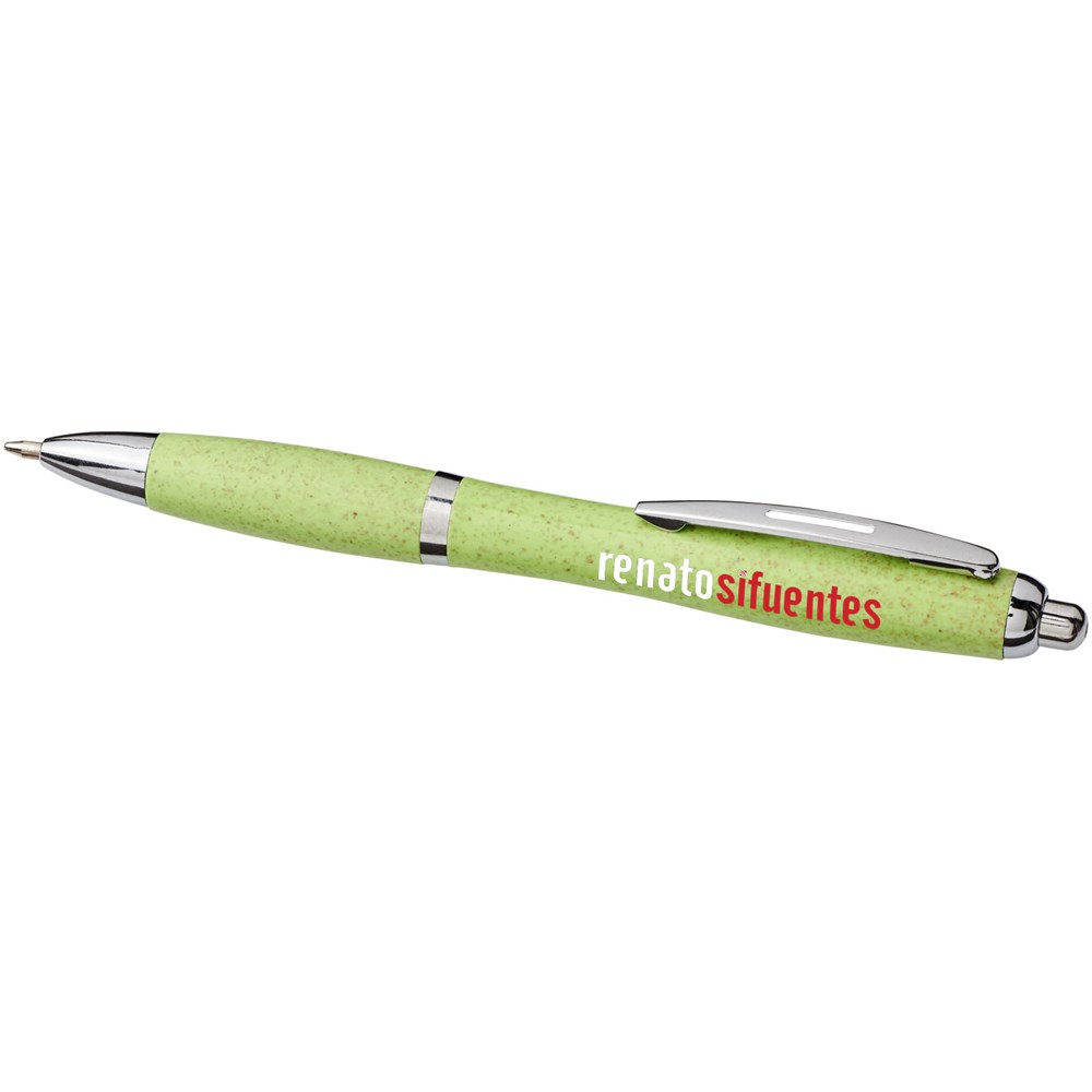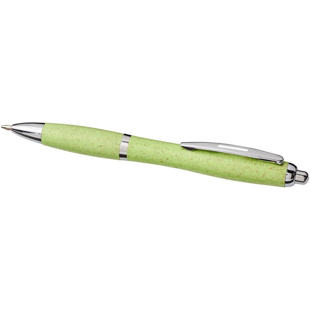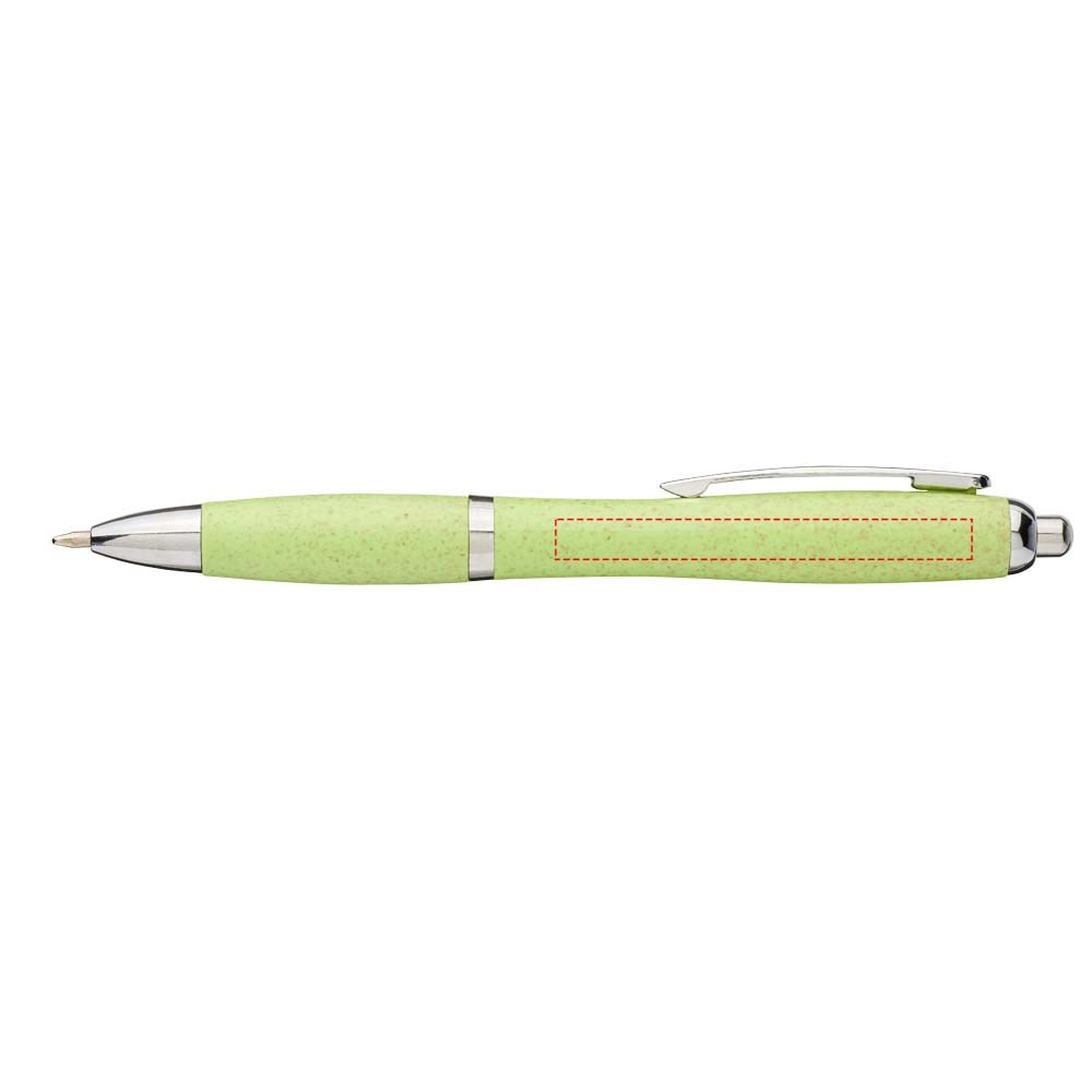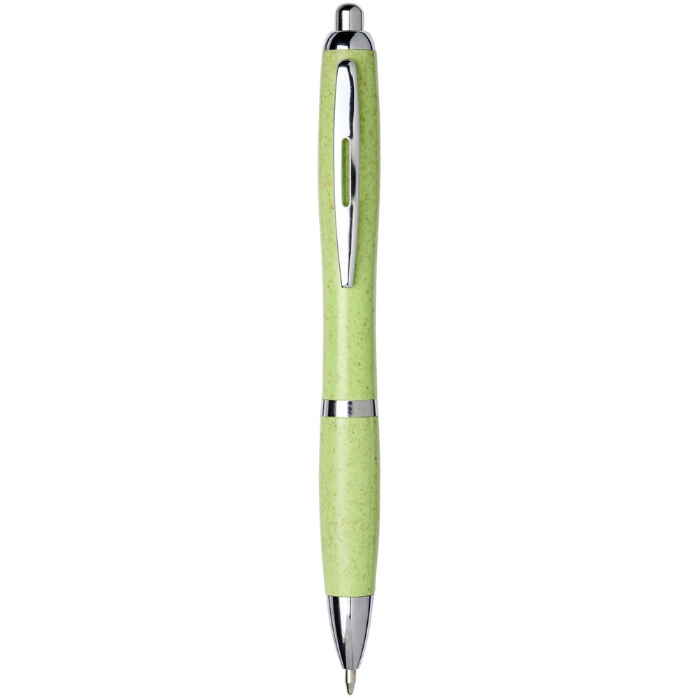Balpen met klikmechanisme, met een huls van tarwestro en afgewerkt met opvallende chroomkleurige details. Na het oogsten van de tarwekorrels blijft er tarwestro over, waardoor er minder plastic wordt gebruikt.