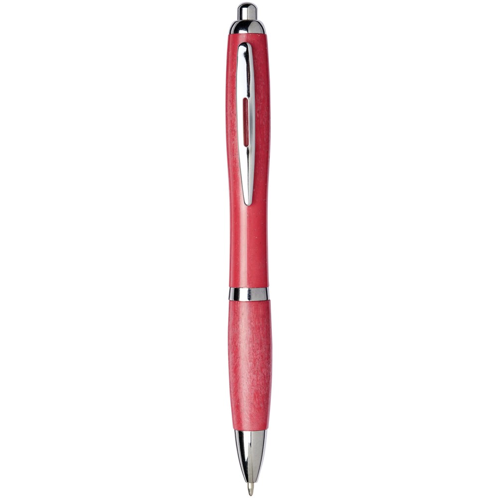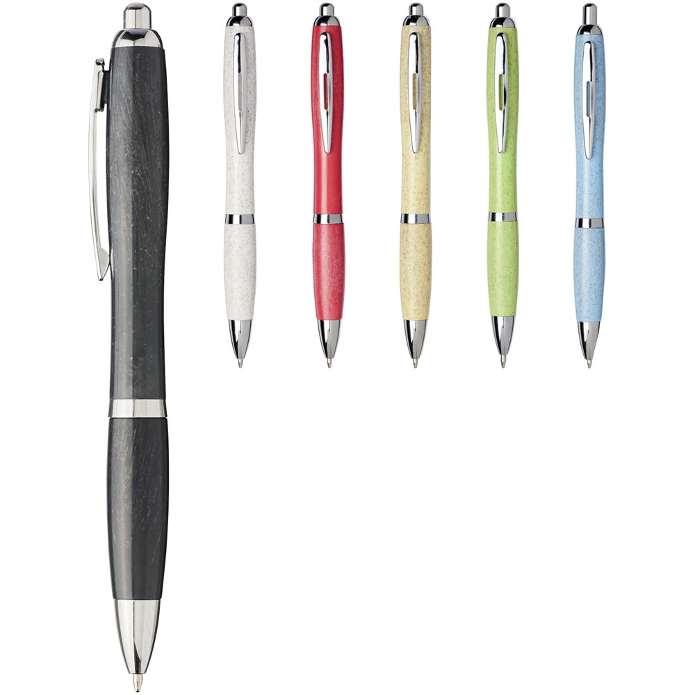 Balpen met klikmechanisme, met een huls van tarwestro en afgewerkt met opvallende chroomkleurige details. Na het oogsten van de tarwekorrels blijft er tarwestro over, waardoor er minder plastic wordt gebruikt.