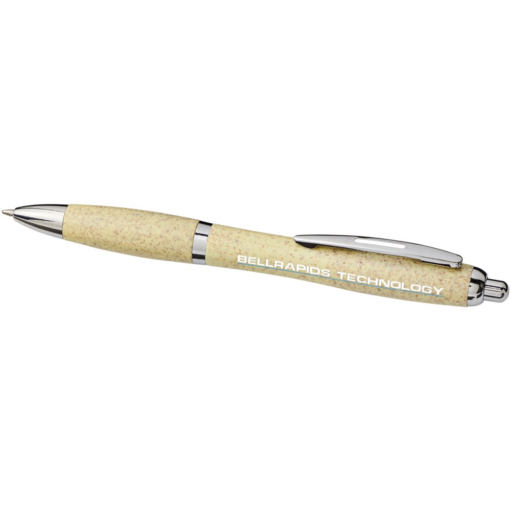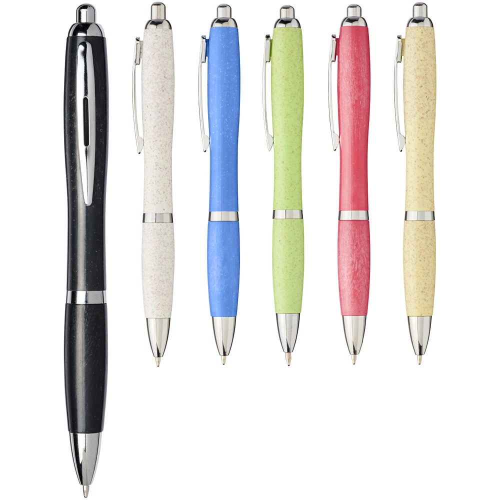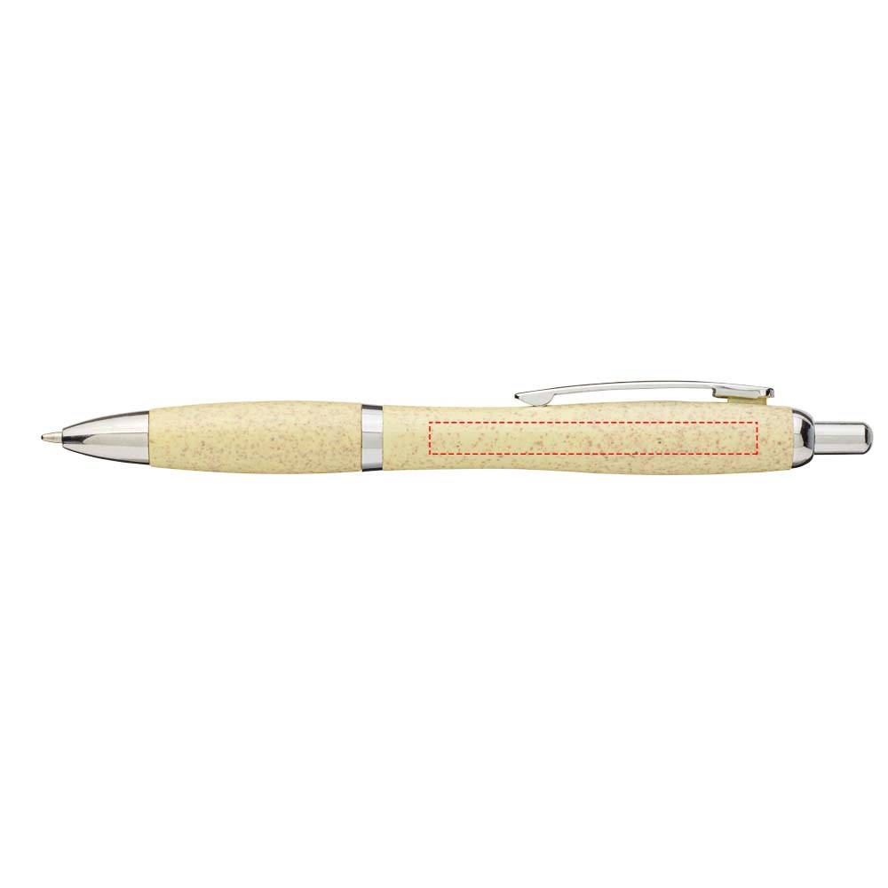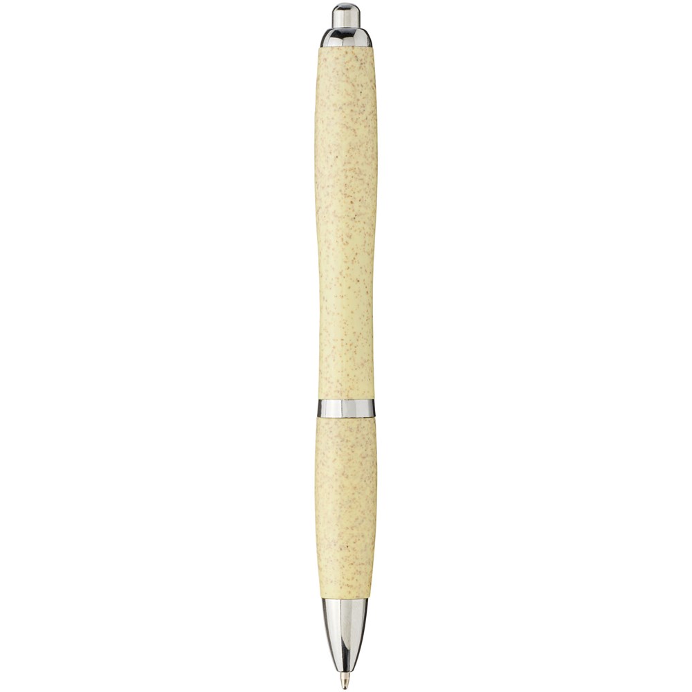 Balpen met klikmechanisme, met een huls van tarwestro en afgewerkt met opvallende chroomkleurige details. Na het oogsten van de tarwekorrels blijft er tarwestro over, waardoor er minder plastic wordt gebruikt.