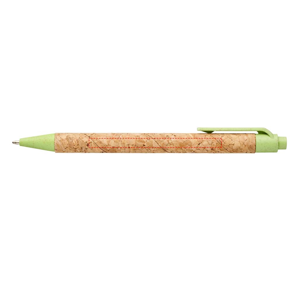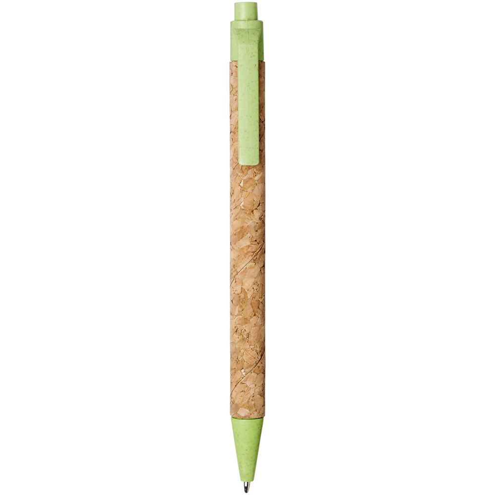 Ecovriendelijke balpen met klikmechanisme, met een huls van kurk en tarwestrostro in verschillende kleuren. Tarwestro blijft over na het oogsten van de tarwekorrels. Dit vermindert het gebruik van plastic, wat een milieuvriendelijk alternatief biedt. De kleur van het kurkmateriaal kan variëren.