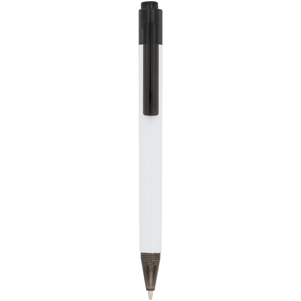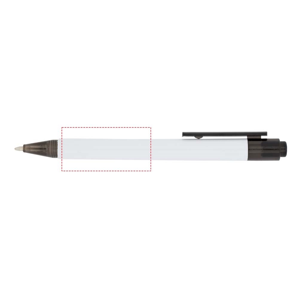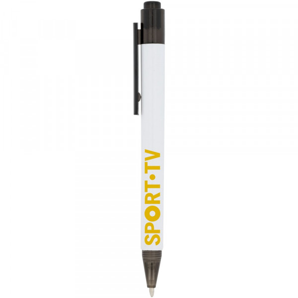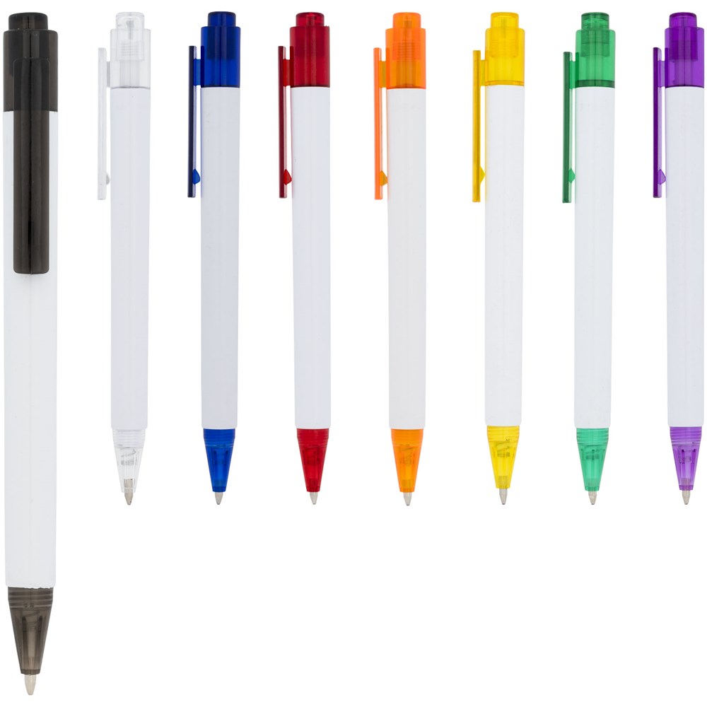 De Calypso-balpen heeft een gladde, witte greep met een doorschijnende gekleurde punt en clip.