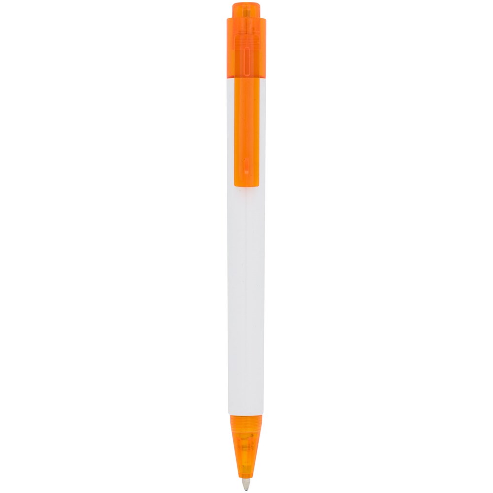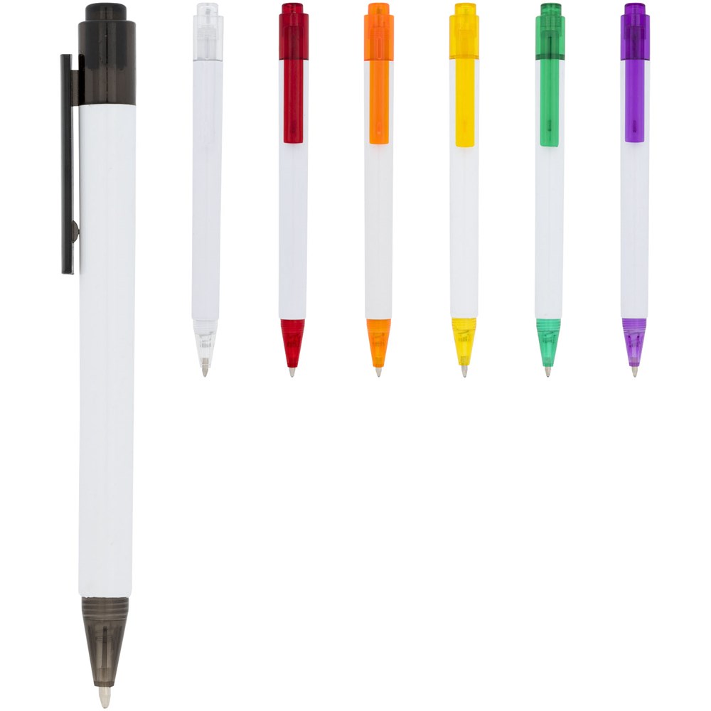 De Calypso-balpen heeft een gladde, witte greep met een doorschijnende gekleurde punt en clip.