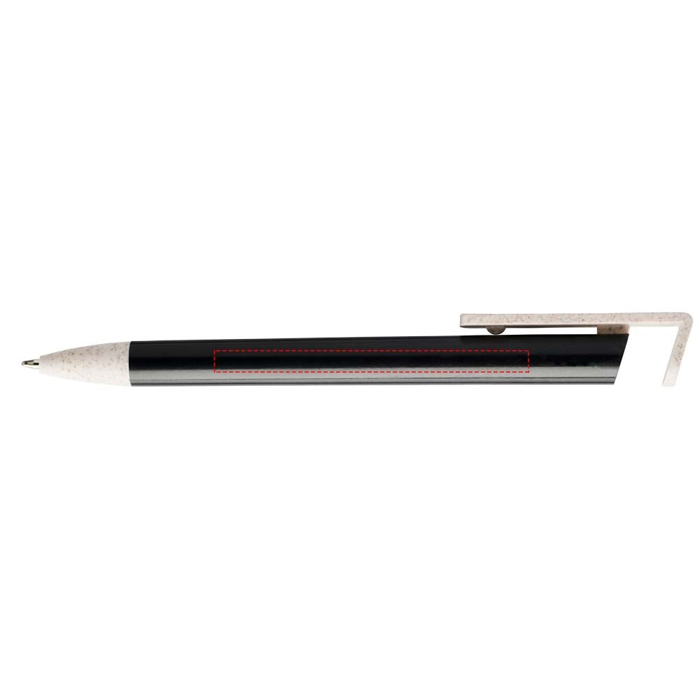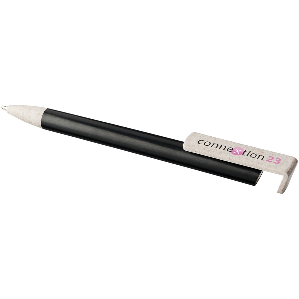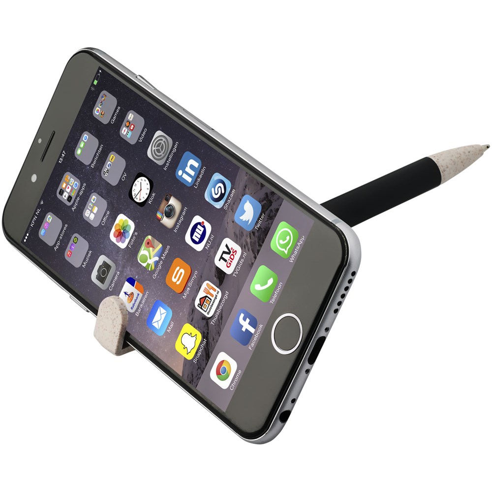 Balpen met klikmechanisme gemaakt van tarwestro. Na het oogsten van de tarwekorrels blijft er tarwestro over, waardoor er minder plastic wordt gebruikt. Het bovenste deel van de pen dient tevens als smartphone-houder voor handsfree gebruik.