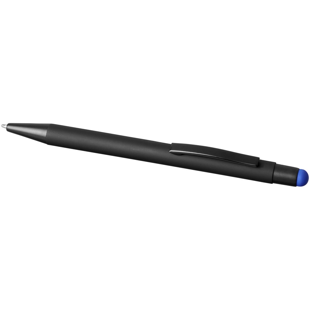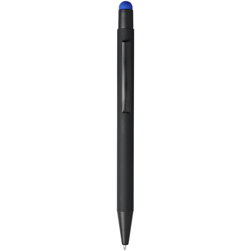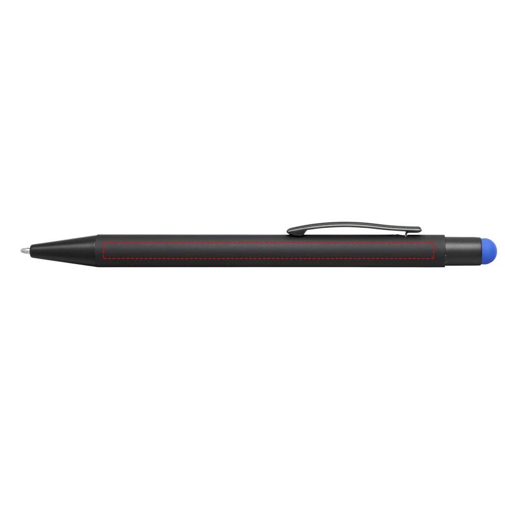 Rubber gecoate stylus balpen met klikmechanisme. De kleur van de styluspunt komt overeen met de lasergegraveerde onderlaag van de pen. De pen heeft een metalen clip, rubberen stylus en is gemaakt van aluminium. Schrijflengte: 450 m.