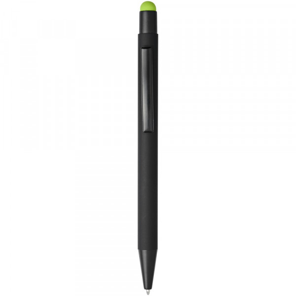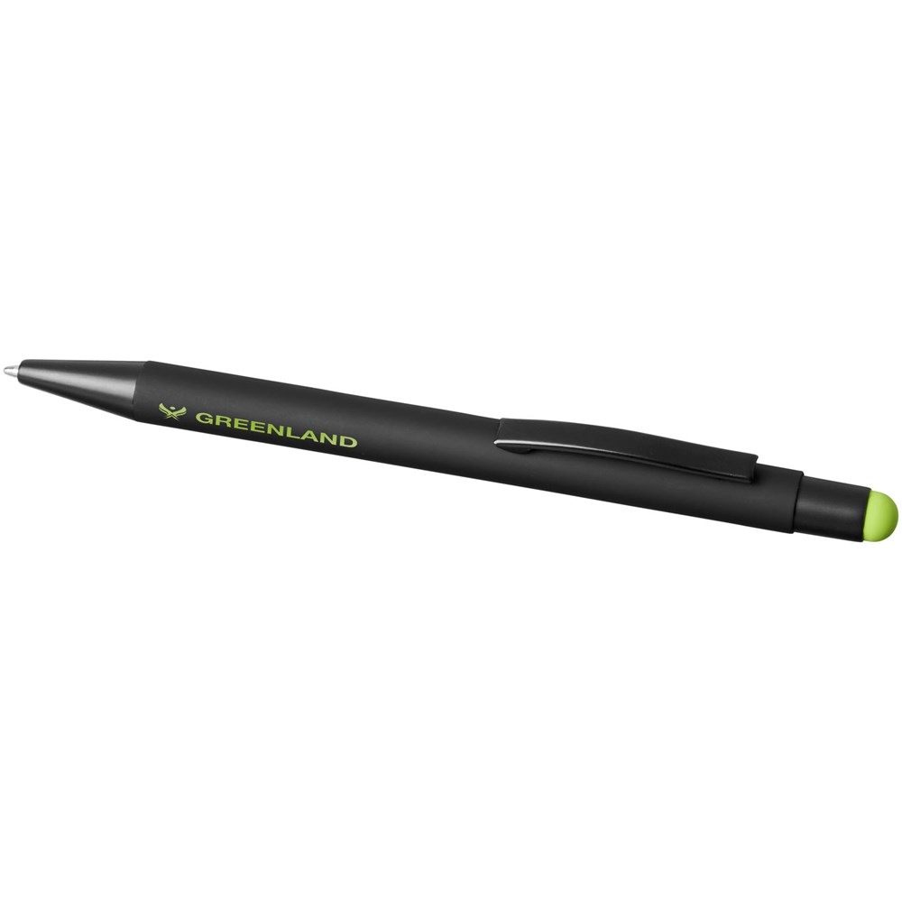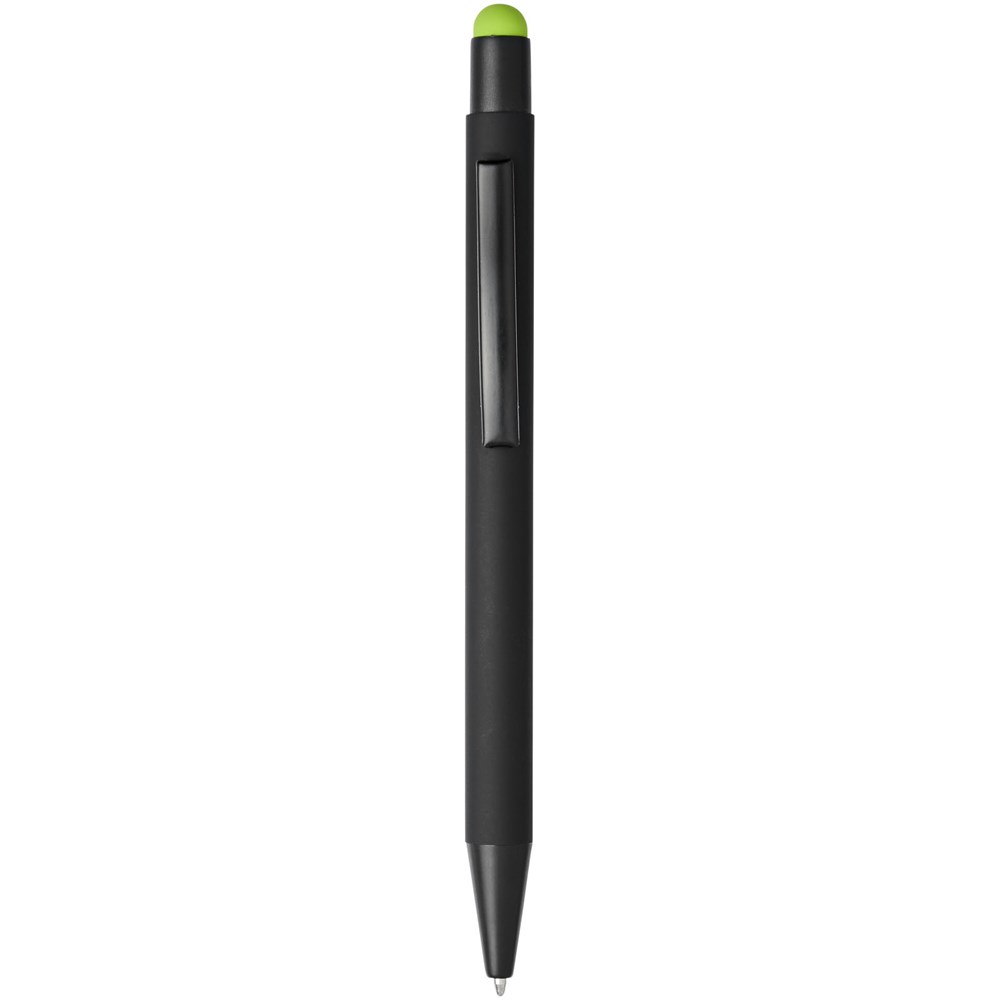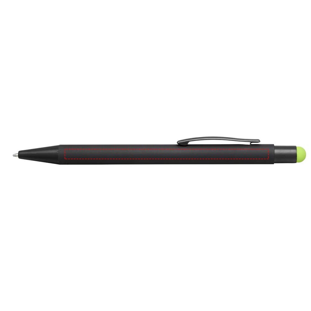 Rubber gecoate stylus balpen met klikmechanisme. De kleur van de styluspunt komt overeen met de lasergegraveerde onderlaag van de pen. De pen heeft een metalen clip, rubberen stylus en is gemaakt van aluminium. Schrijflengte: 450 m.