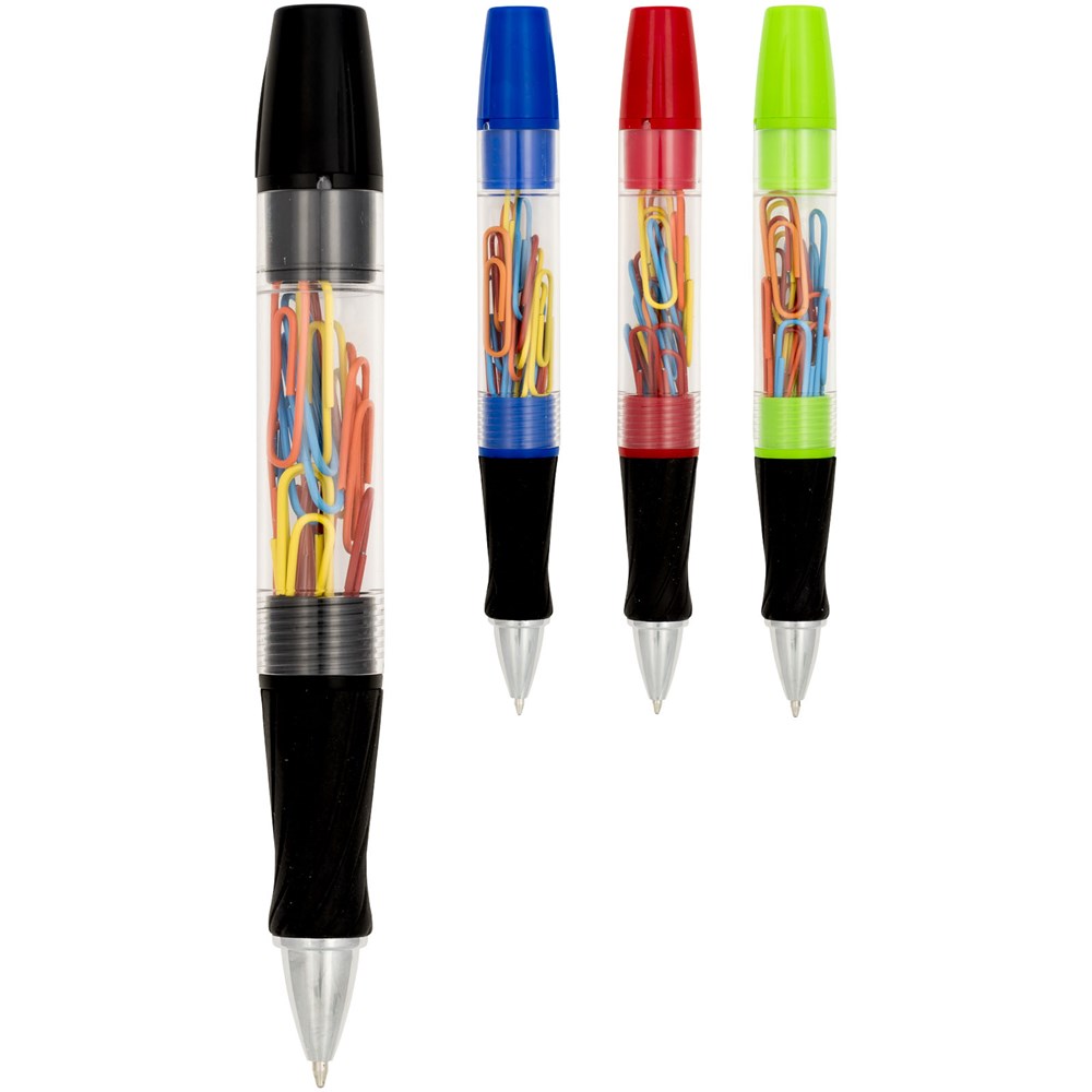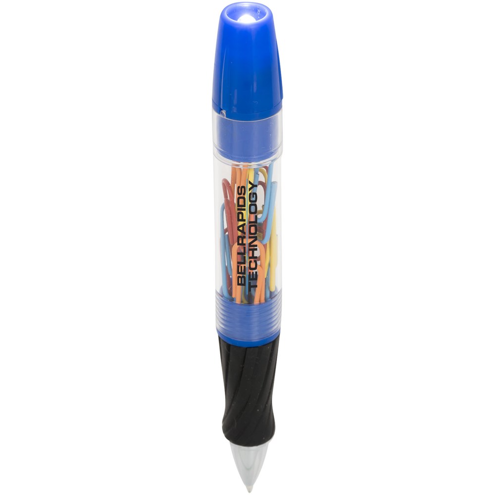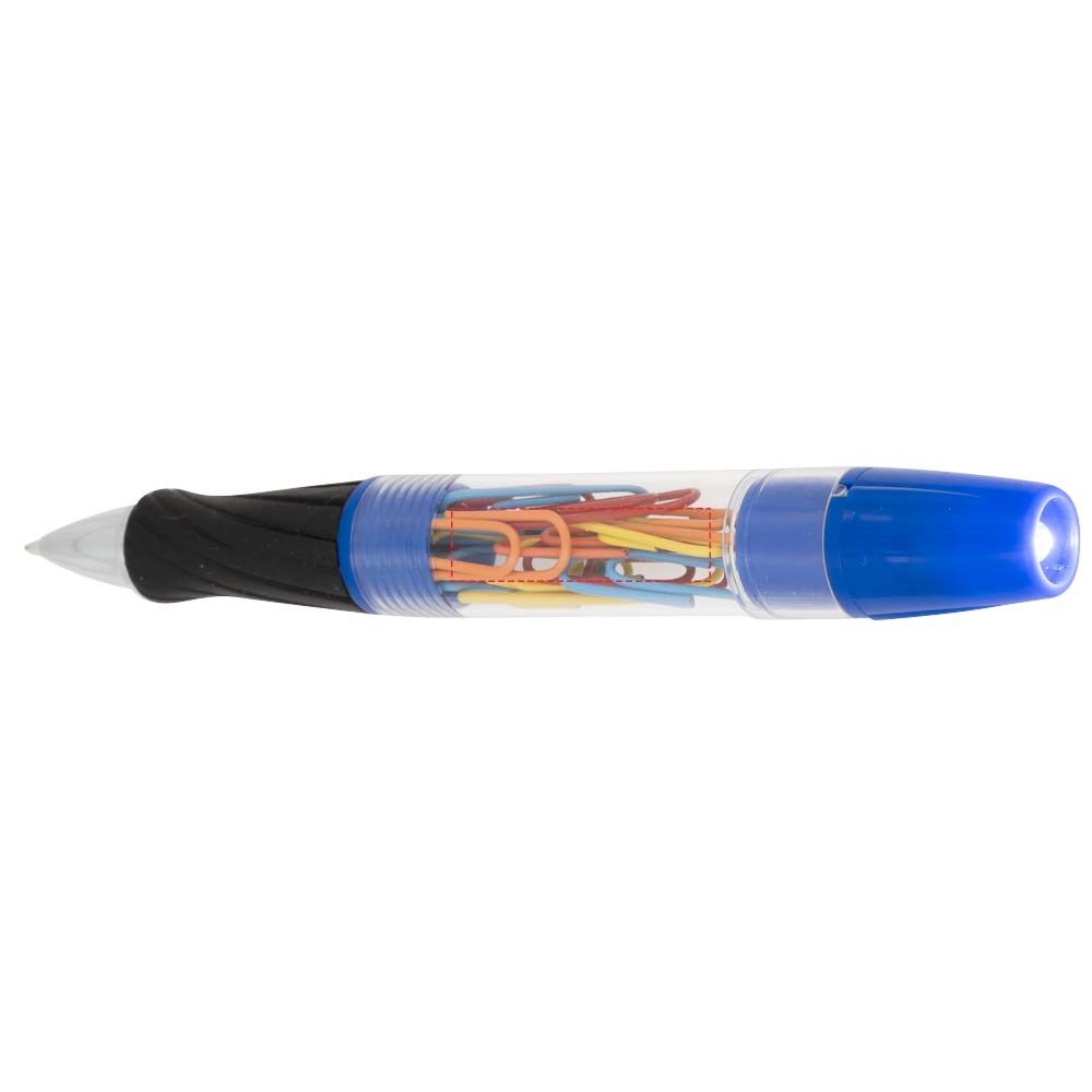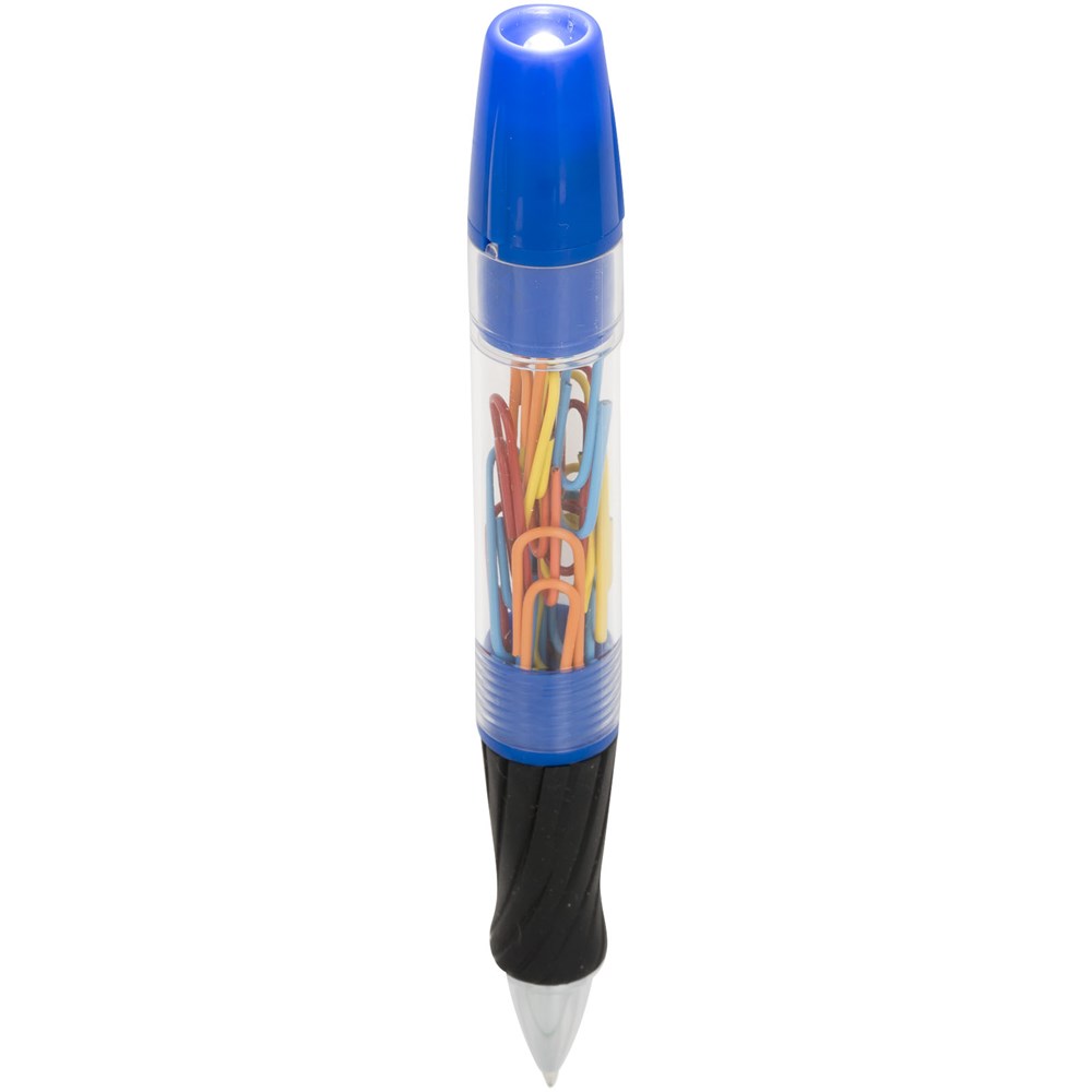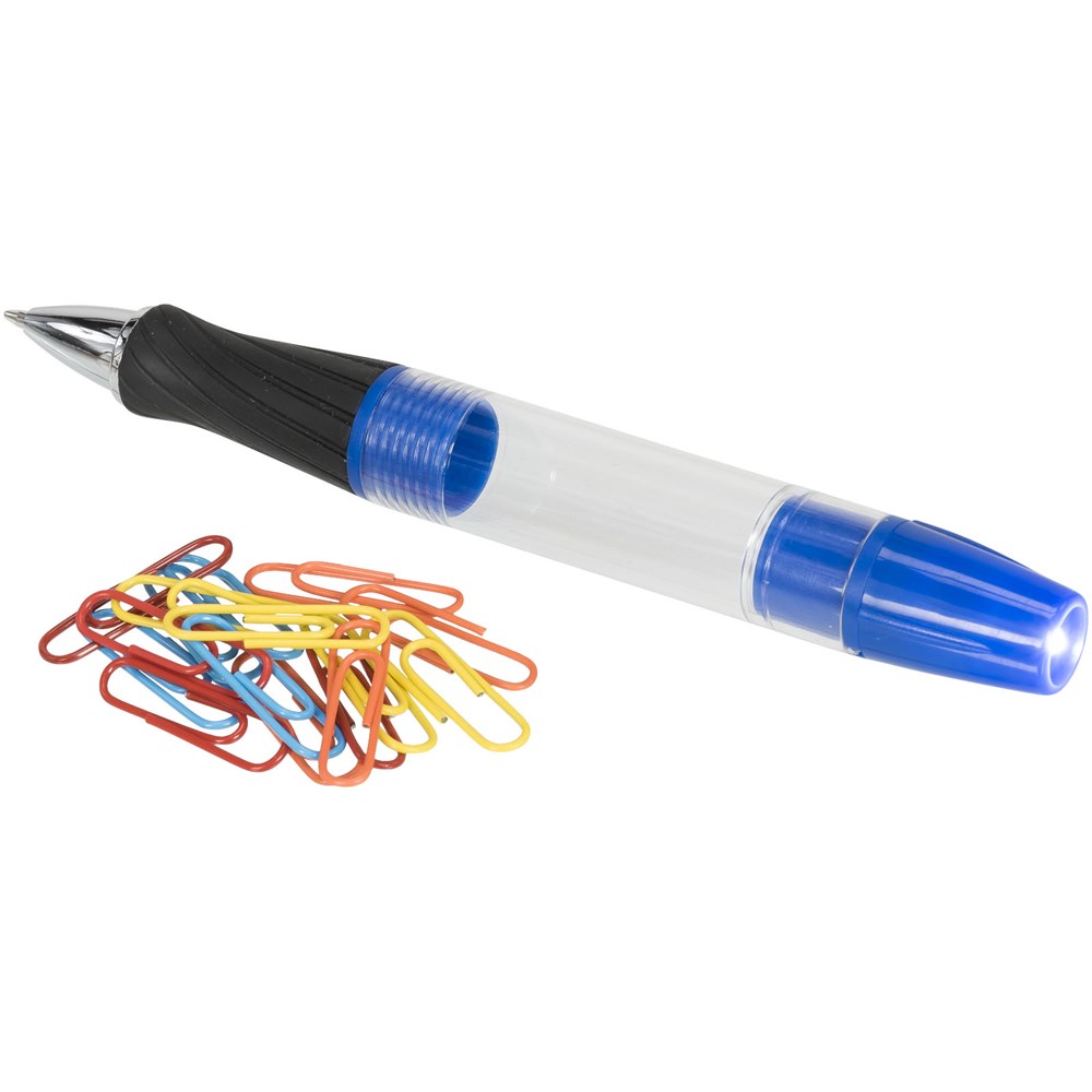 Balpen met draaimechanisme aan de voorzijde, afschroefbare schacht met paperclips en LED-lampje...meer