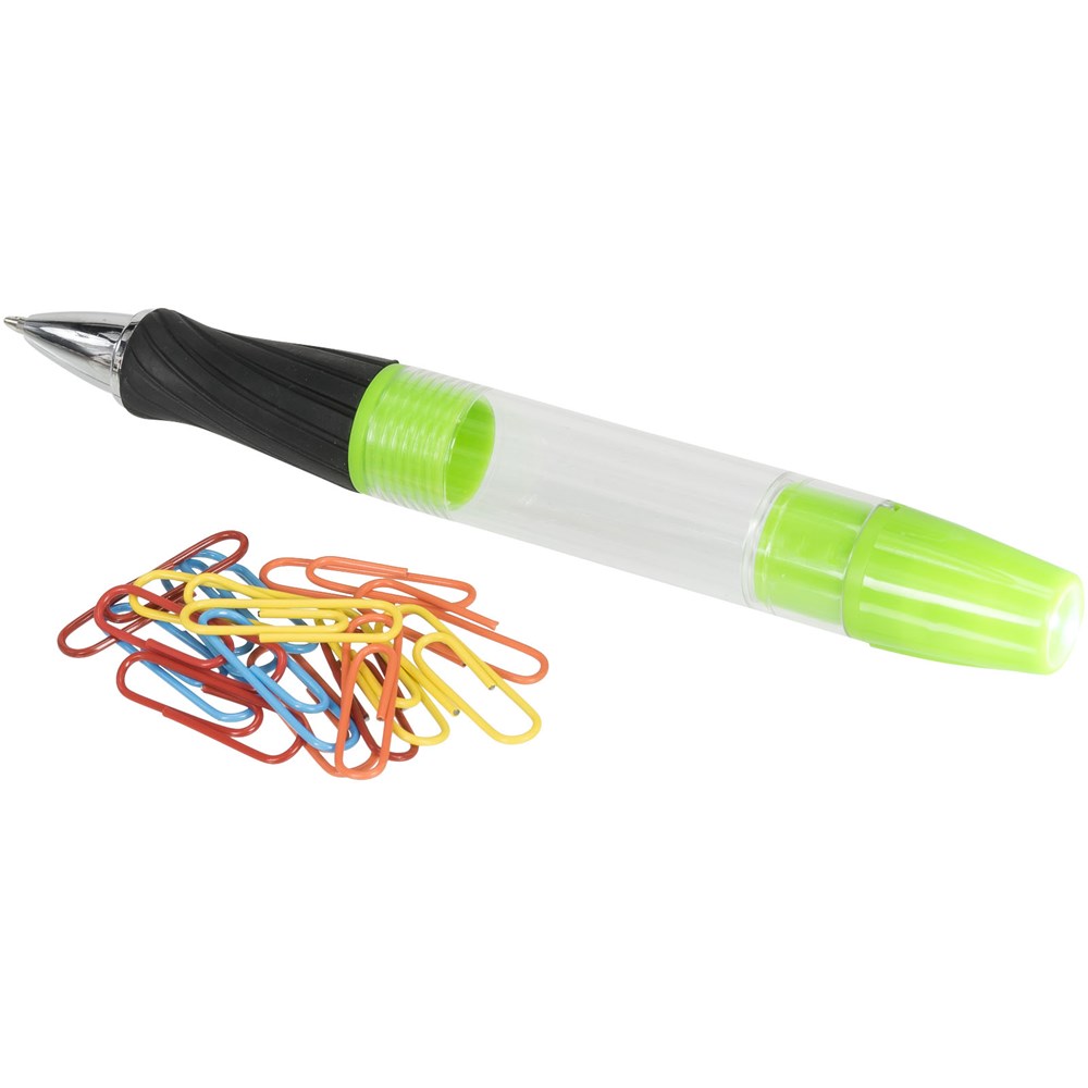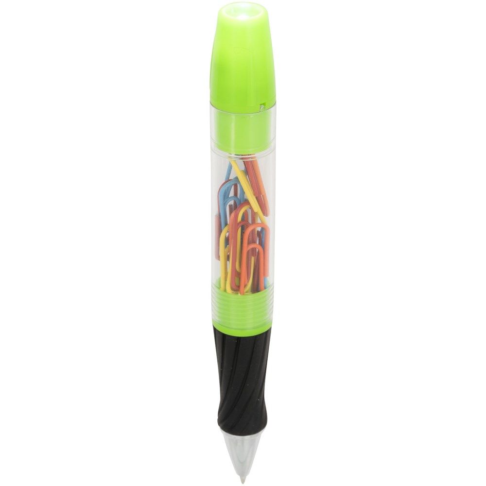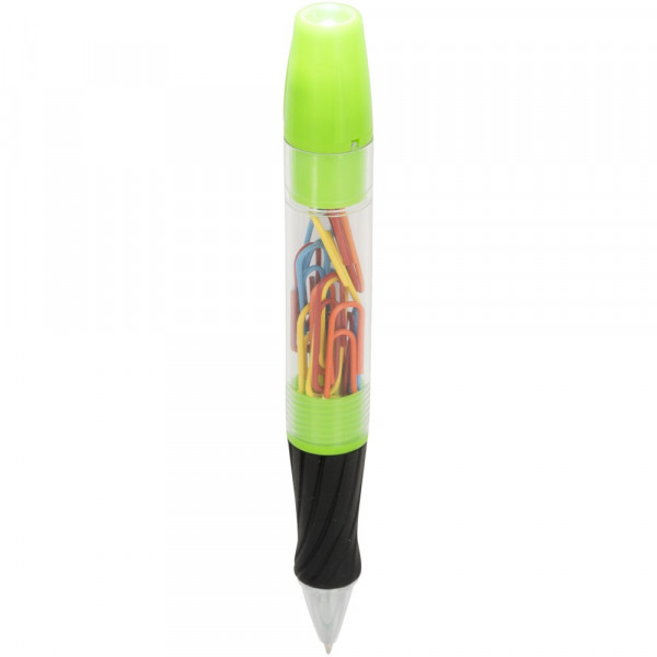 Balpen met draaimechanisme aan de voorzijde, afschroefbare schacht met paperclips en LED-lampje met draaimechanisme aan het uiteinde. inclusief batterijen.