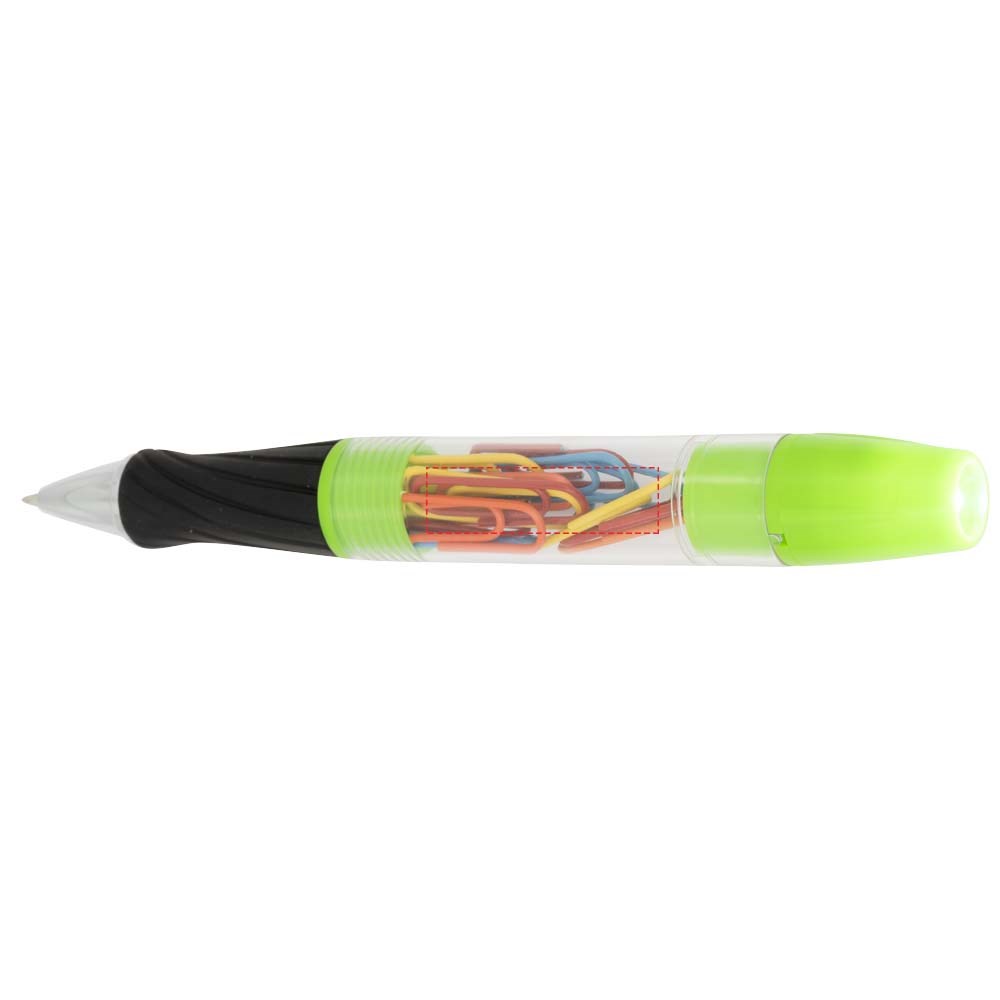 Balpen met draaimechanisme aan de voorzijde, afschroefbare schacht met paperclips en LED-lampje...meer