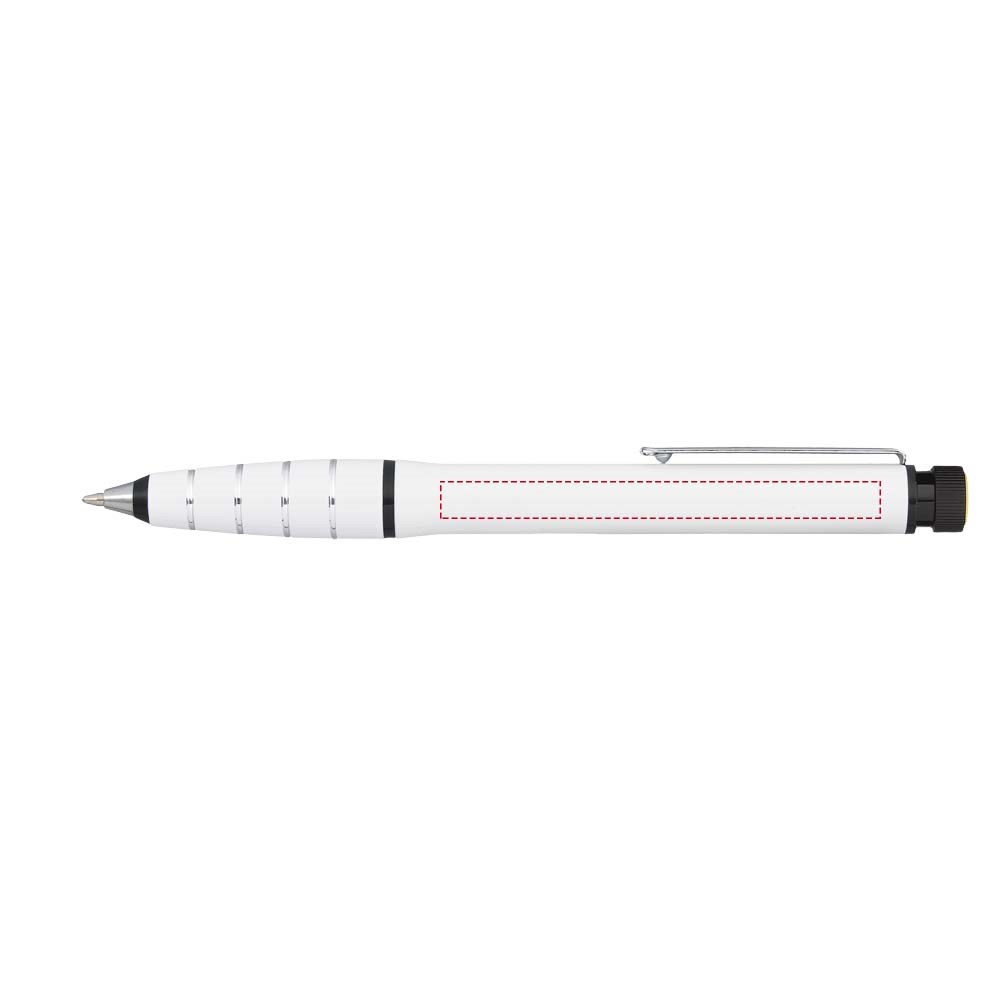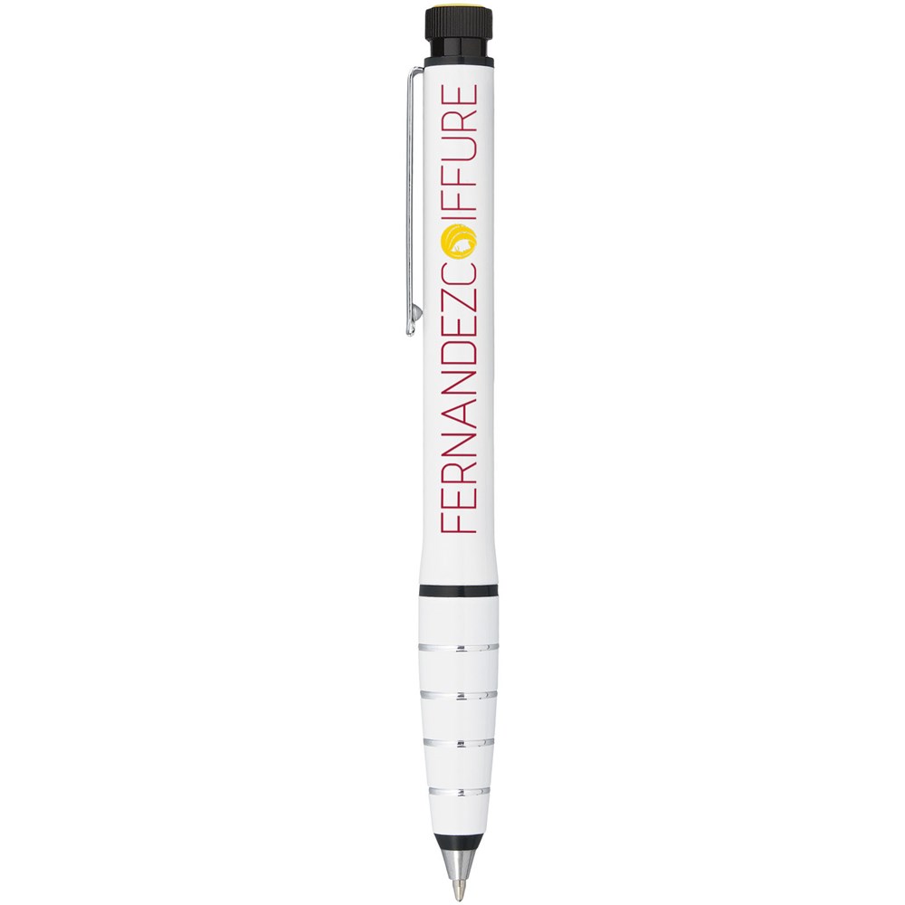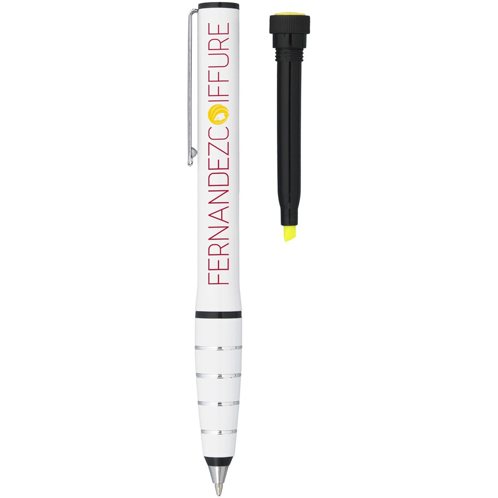 Balpen met draaimechanisme en uitneembare markeerstift. Zwartschrijvend.