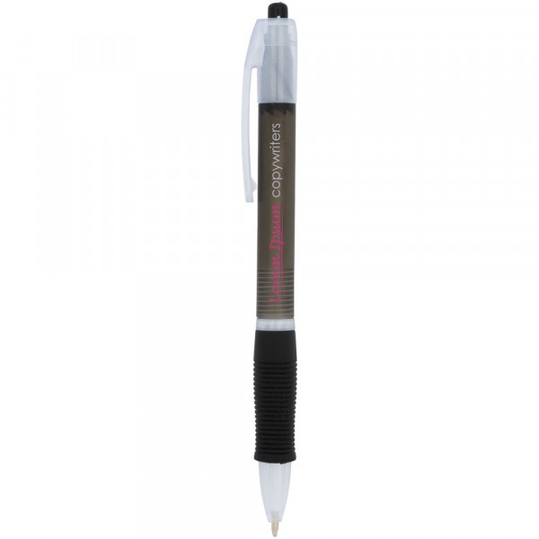 Kleurrijke klik balpen met bijpassende kleur rubberen grip. Blauwschrijvend.