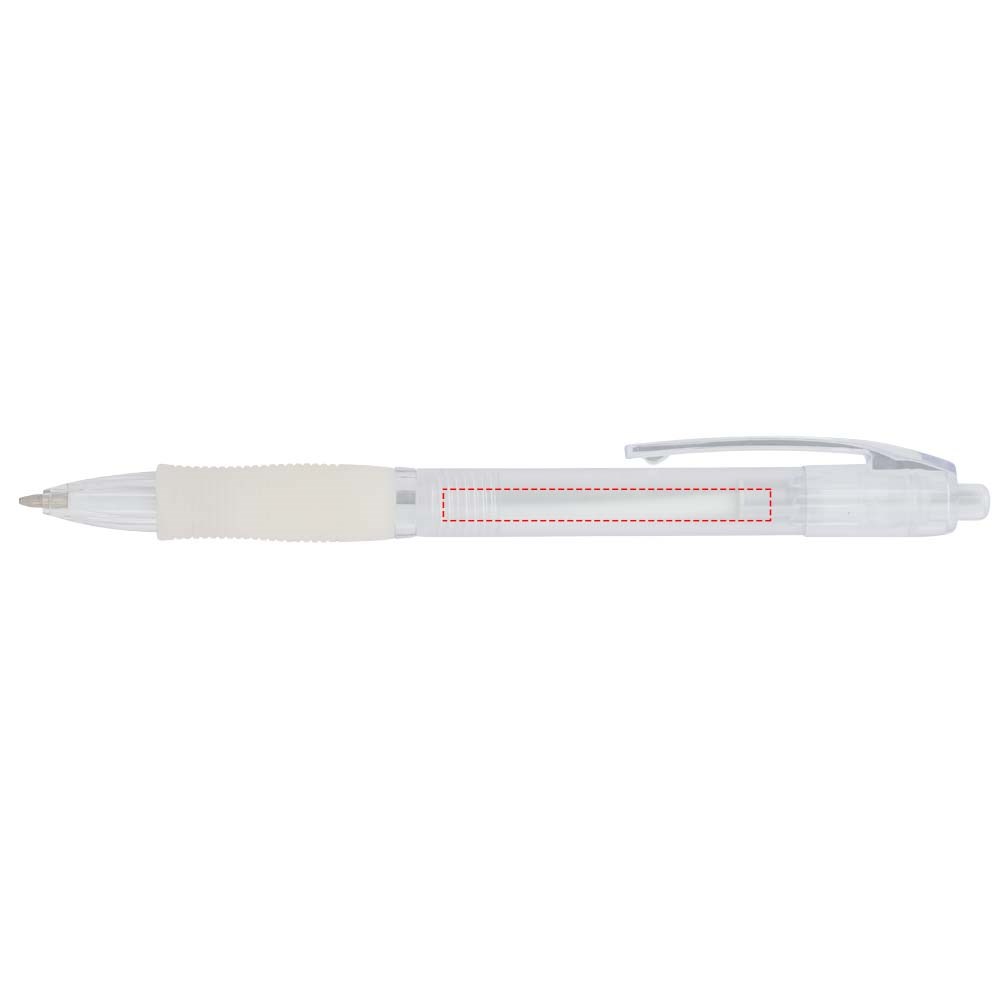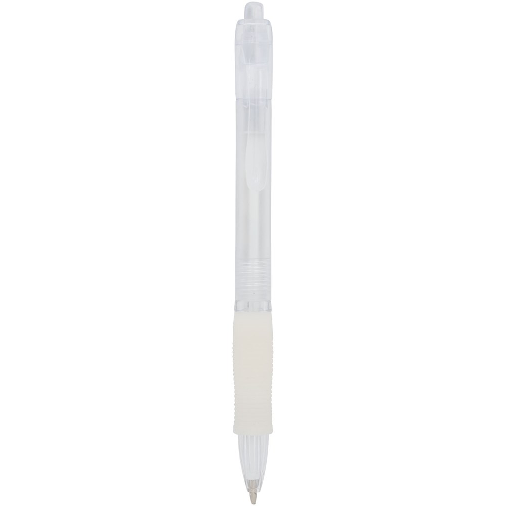 Kleurrijke klik balpen met bijpassende kleur rubberen grip. Blauwschrijvend.