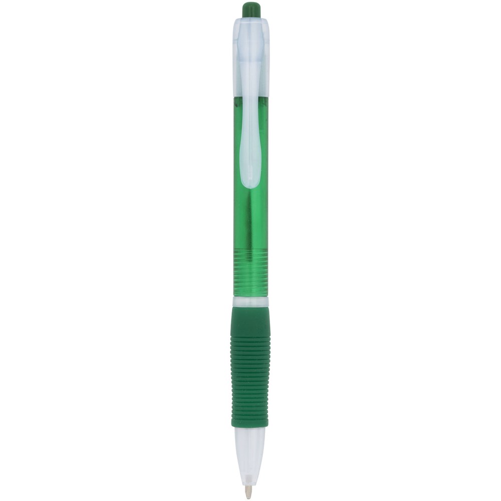 Kleurrijke klik balpen met bijpassende kleur rubberen grip. Blauwschrijvend.