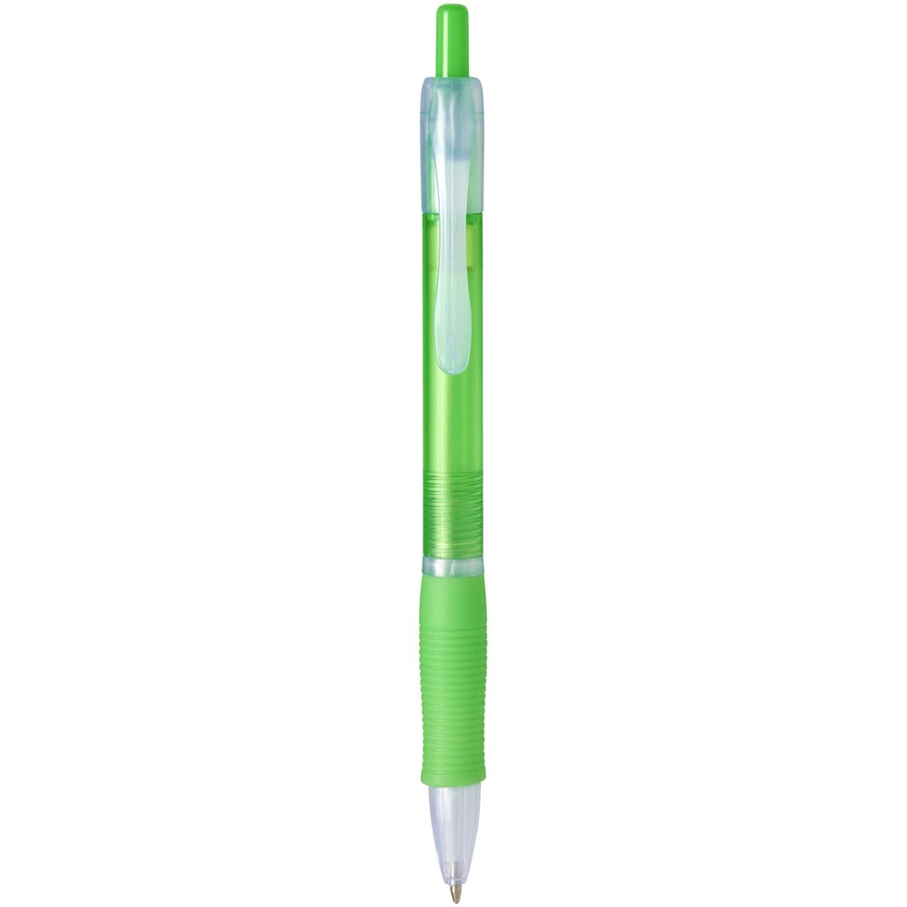 Kleurrijke klik balpen met bijpassende kleur rubberen grip. Blauwschrijvend.