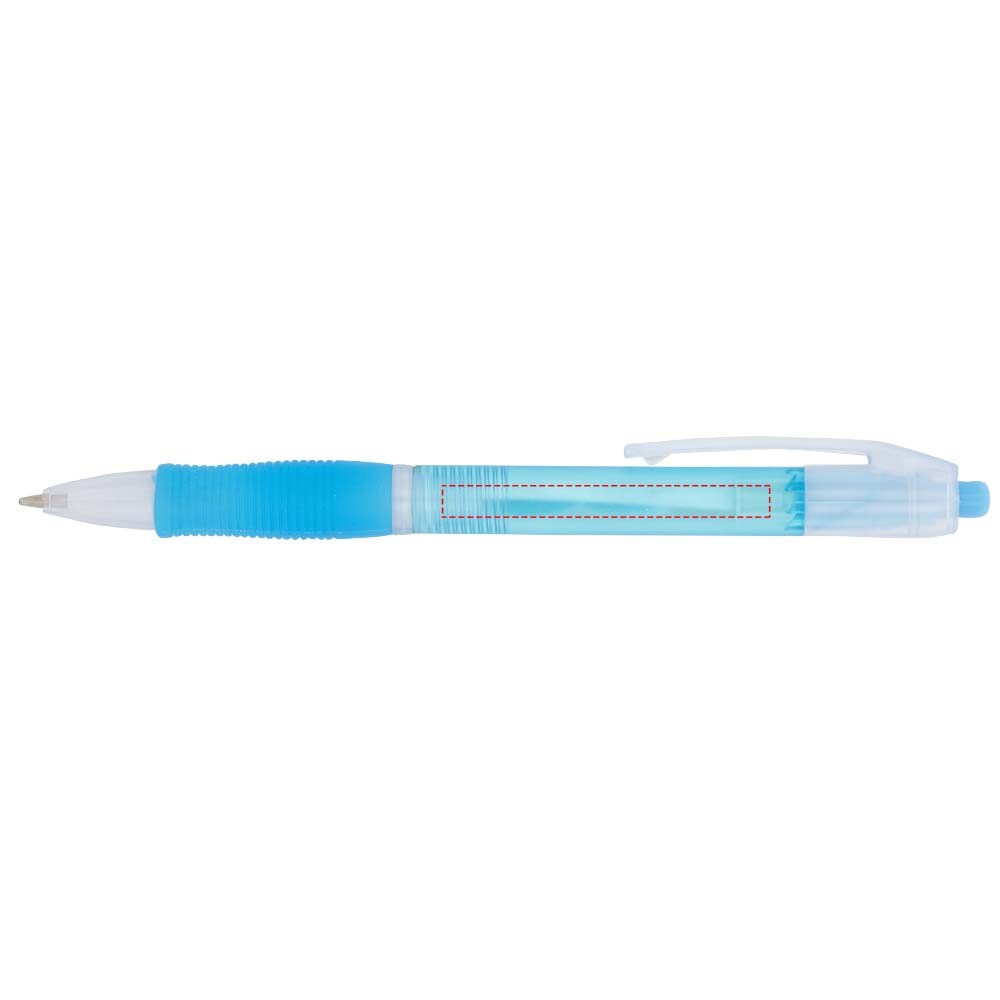 Kleurrijke klik balpen met bijpassende kleur rubberen grip. Blauwschrijvend.