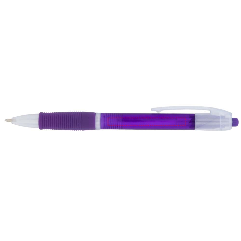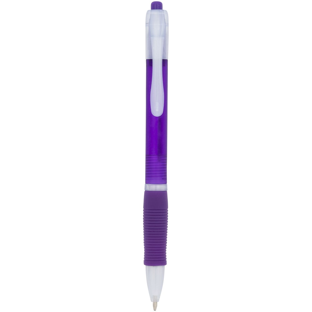 Kleurrijke klik balpen met bijpassende kleur rubberen grip. Blauwschrijvend.