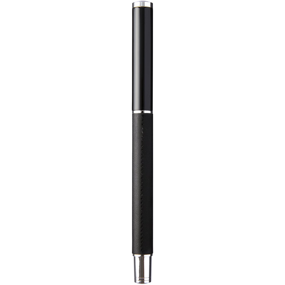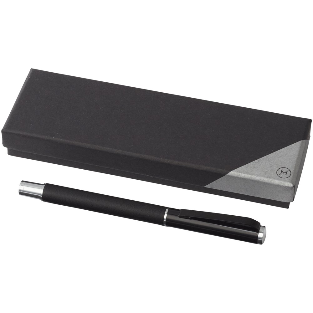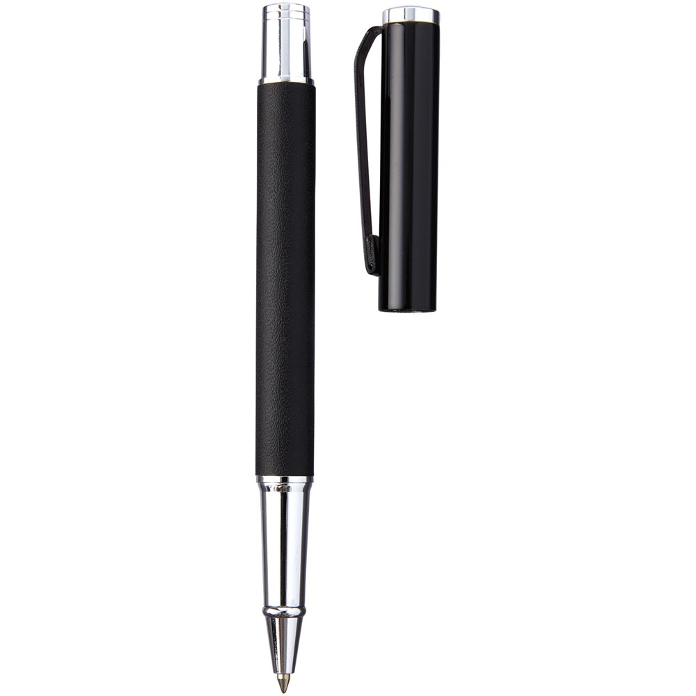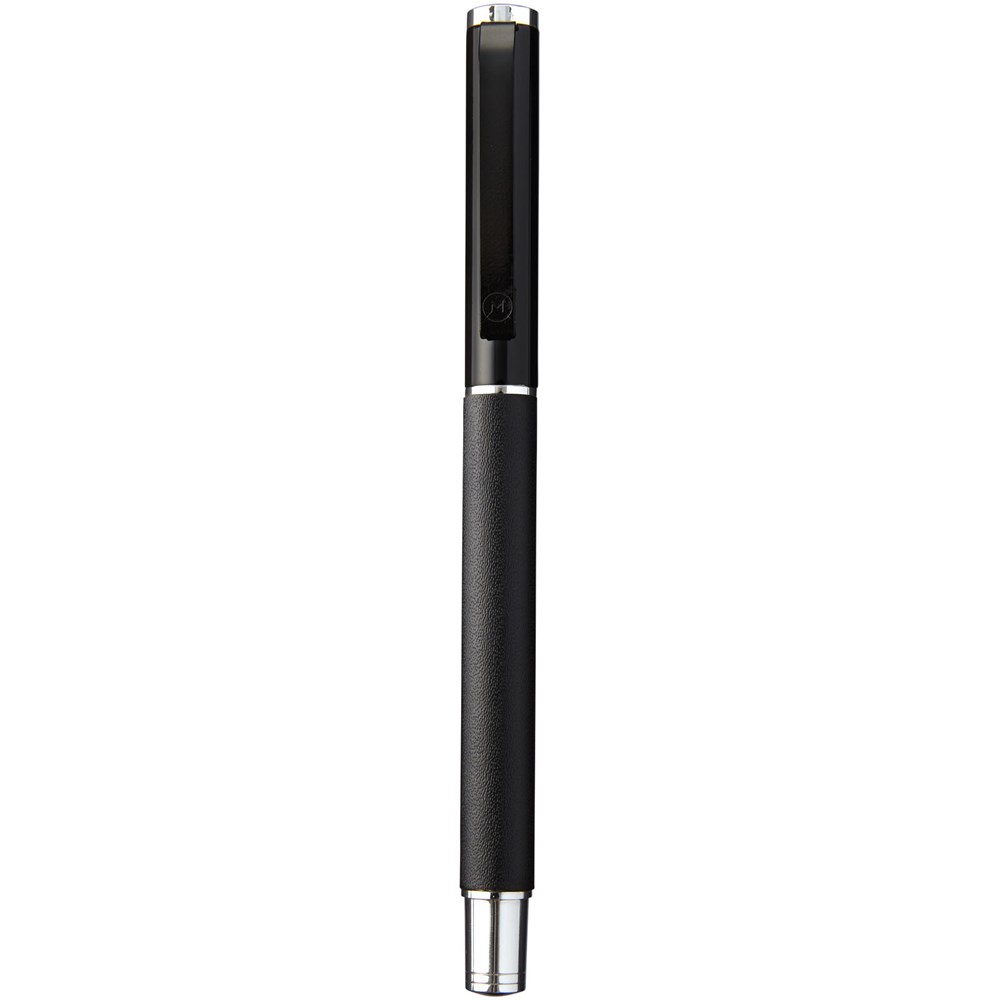 Rollerpen met exclusief design. Huls voorzien van PU leer, met matzwart bovendeel en chroomkleurige accenten. Pen bevat premium zwarte inktrollercartridge. Verpakt in een Marksman® geschenkverpakking met twee stuks.