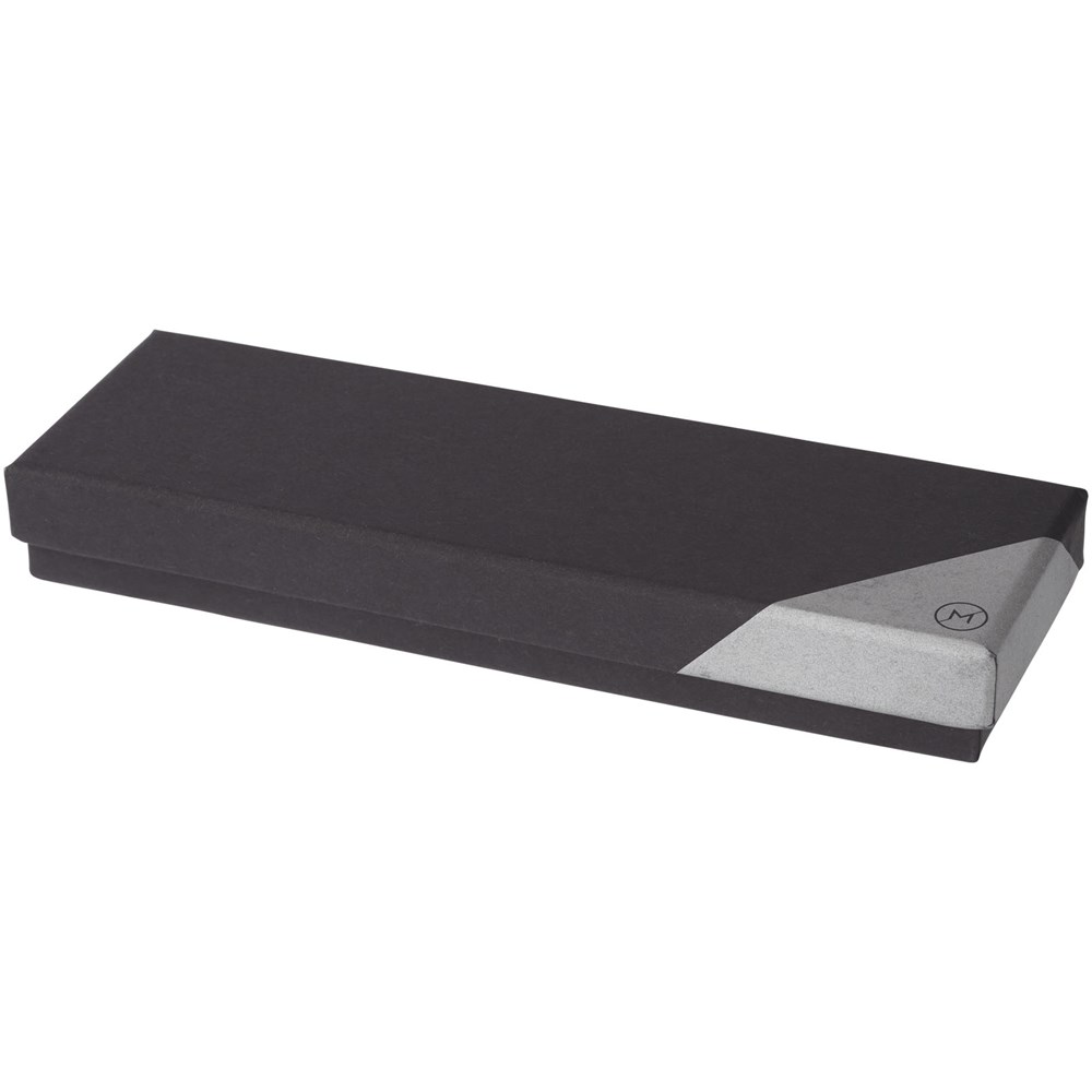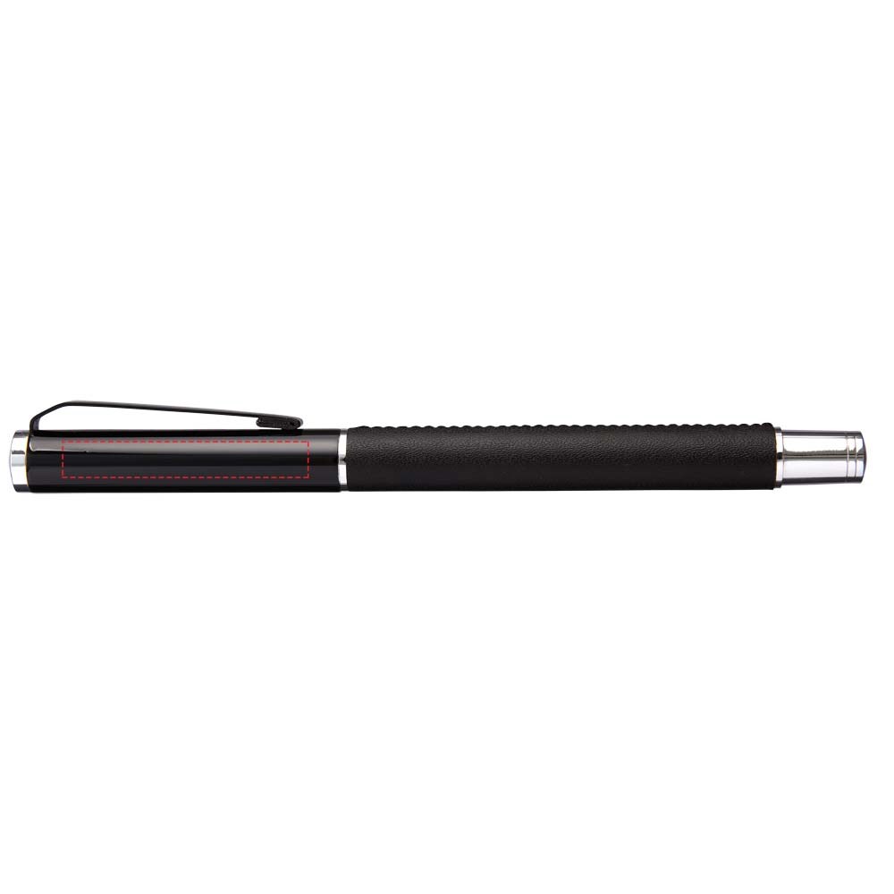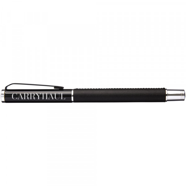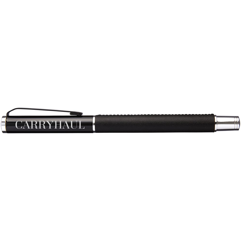 Rollerpen met exclusief design. Huls voorzien van PU leer, met matzwart bovendeel en chroomkleurige accenten. Pen bevat premium zwarte inktrollercartridge. Verpakt in een Marksman® geschenkverpakking met twee stuks.