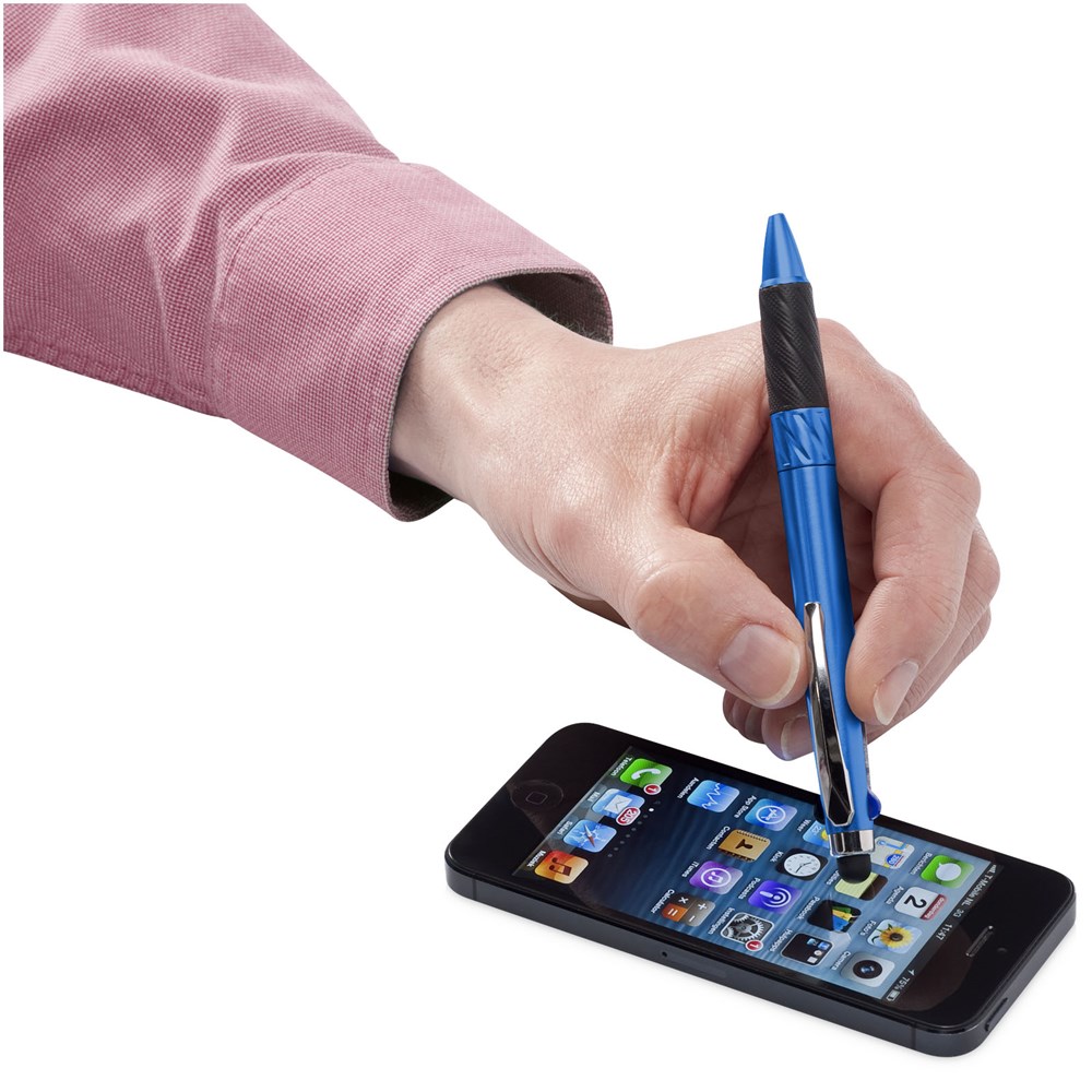 Stylus balpen met meerdere kleuren inkt, klikmechanisme en rubbergreep. Incl. zwarte, blauwe en rode vulling.